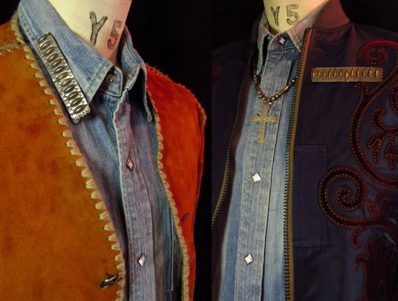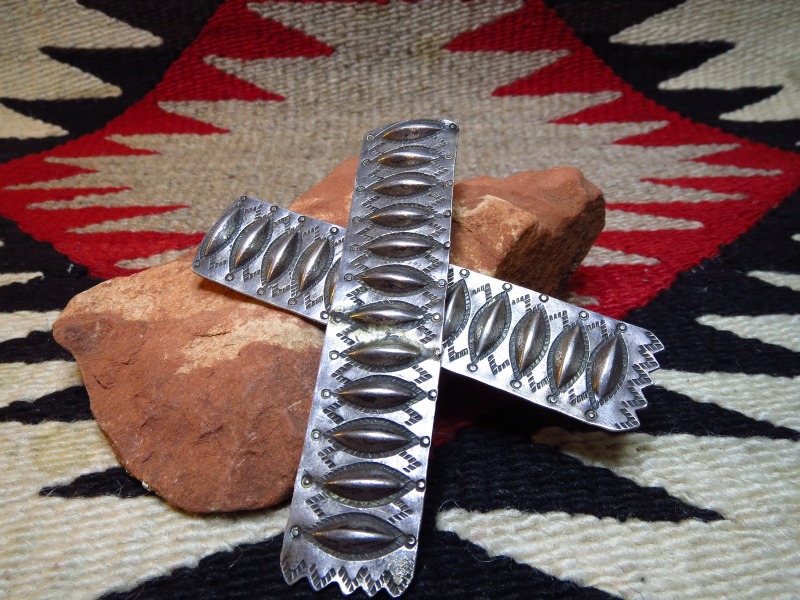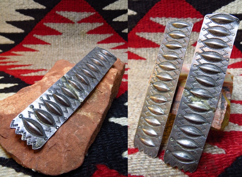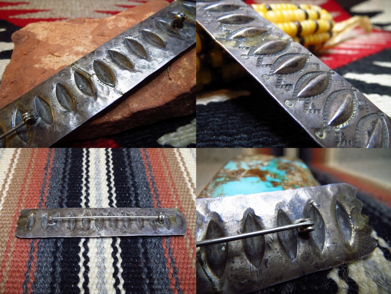 こちらのようなエリ用のピンやボタン、カラーオーナメントは非常に古くから作られている伝統的なアイテムの一つで、襟のシェイプに添うような三角形のタイプと、こちらのようなバー形状のタイプが存在しており、どちらも現代に残っている古い写真等で多くのインディアン達が身に付けている姿が確認できます。