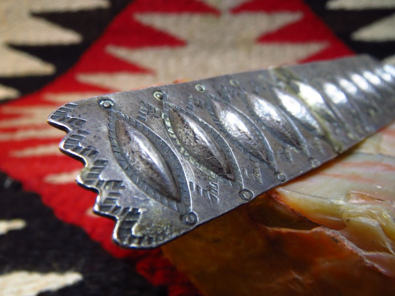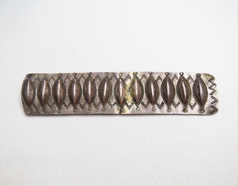 カラーオーナメントとしては、とてもオーセンティックな造形のピースで、板状に叩きのばされたシルバーにアイシェイプのリポウズが羅列されています。さらに細かなスタンプワークが施され、片方のエッジはカッティングによりジグザグのシェイプに造形されています。古い作品独特の荒さもありますが、全てハンドメイドにより仕上げられた味わい深いピンブローチです。