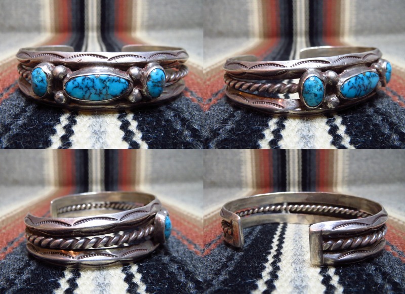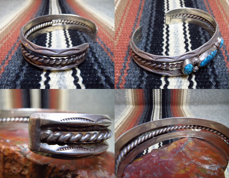 ナバホのトラディッショナルな造形スタイルの一つであるローワーク(石が羅列された)に構成され、2本のトライアングルワイヤーに挟まれるようにターコイズがセットされています。さらに、トライアングルワイヤーの間にはツイステッドワイヤーが配され、武骨な印象を持った作品ながら、おそらくインゴット(銀塊)から成形されたと思われるシルバーの質感は素晴らしく、スタンプワーク等やシルバーボール等、細部まで丁寧な仕事で作りこまれた作品です。