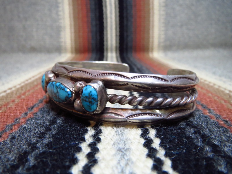 【NAVAJO】ナバホの作品、1940年代後半~60年代製と思われるピースで、素晴らしいオールドローンマウンテンターコイズが3つセットされたアンティーク/ビンテージバングルです。