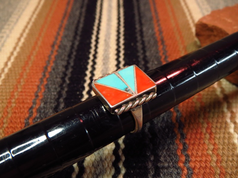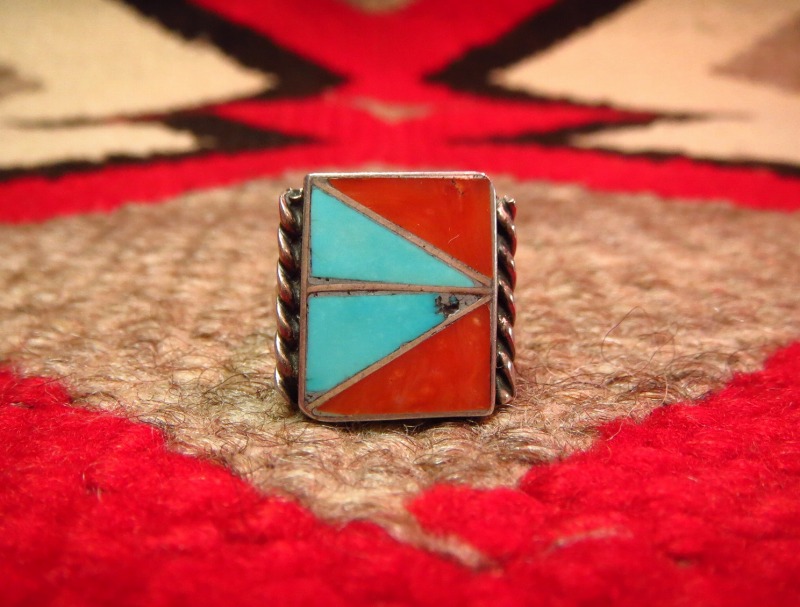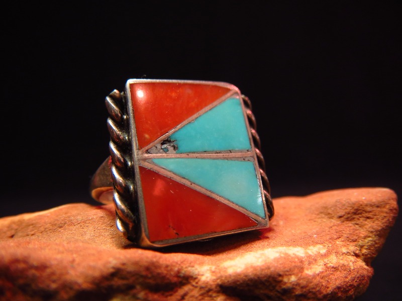 1970年代~90年代頃に作られたと思われるピースで、スクエアフェイスにコーラルとターコイズが三角形にカットされ、グラフィティカルにインレイされています。さらに、ベゼルのサイドにはツイステッドワイヤーが施されており、大胆で現代的なデザイン構成にインディアンジュエリーらしい味わいを付加するディテールとなっています。