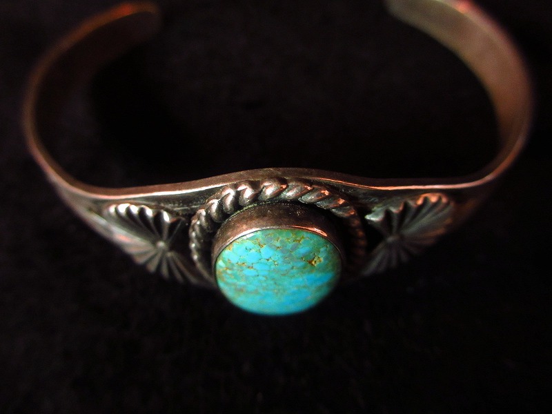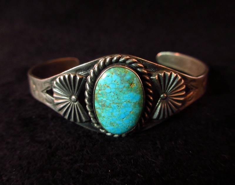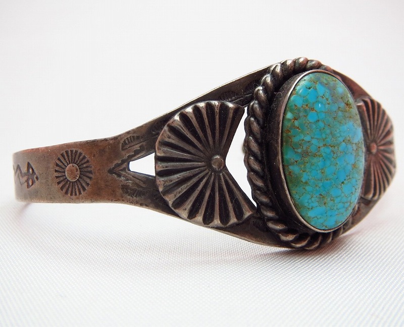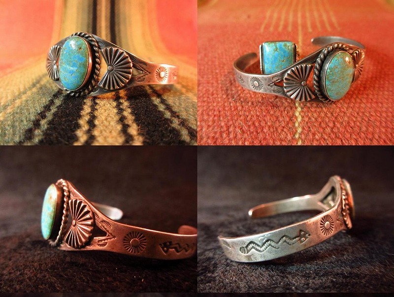 デザイン自体はシンプルな刻印がナバホらしい、フレッド・ハービースタイルを代表する造形。 センターにターコイズとアップリケで重点を置いた腕なじみの良いデザインです。