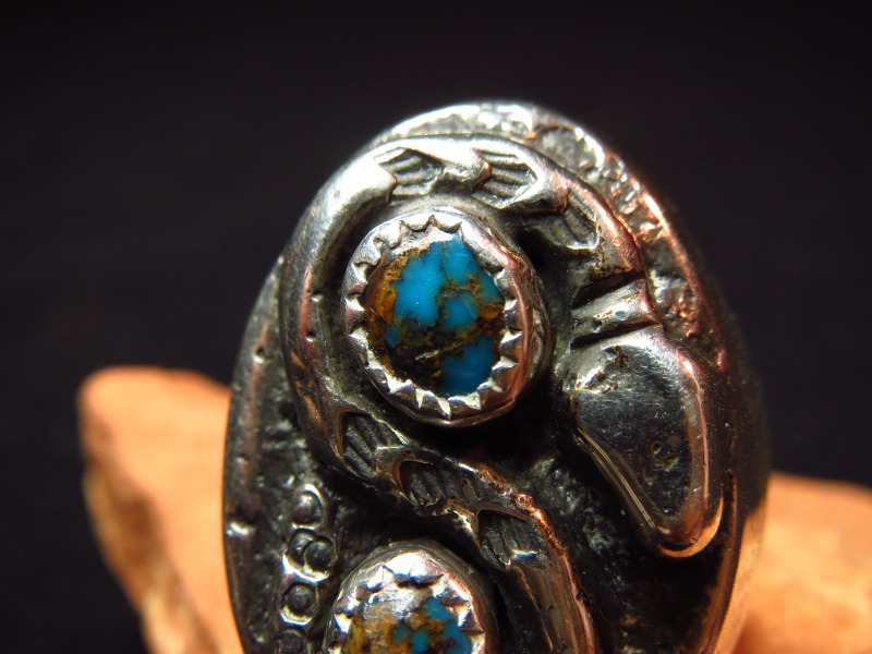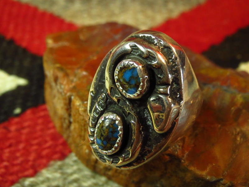 こちらはおそらく、1970年代後半頃に制作されたものと推測され、重厚なシャンクはキャストで成形され、大変重く印台のシェイプに造形されています。そのフェイスに、2つの美しいビズビーターコイズがセットされ、それらを守るようにスネークのアップリケ/パッチワークが施されています。また、スネークには細かなスタンプワークが刻まれ、蛇の持つ独特の文様を表現しています。