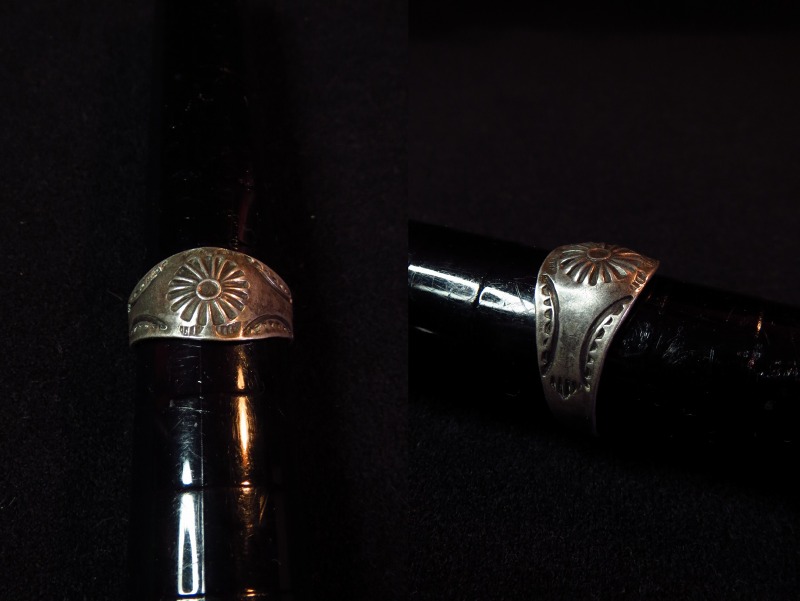 おそらくシャンク(地金)はインゴット(銀塊)から成形されており、正面が少し広くなったクラシックなシェイプで、センターにリポウズと言うハンマーによって立体的に叩き出す造形が施されています。サイドにもプリミティブな印象のスタンプワークが配されていますが、ツーリストジュエリーの初期作品と思われ、多くのツーリストピースに見られるようなキャッチーなモチーフは見られず、シンプルで抽象的なスタンプ(鏨)で仕上げられています。それらのセンターのリポウズや力強いスタンプワークによって迫力を持ち、アンティーク作品らしい素朴ながら悠然とした佇まいをもたらしています。