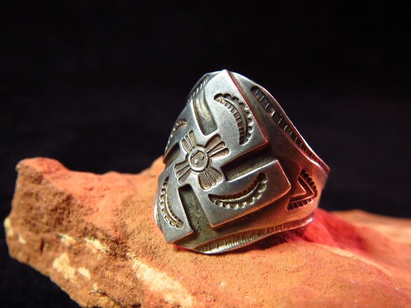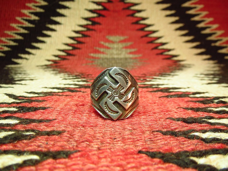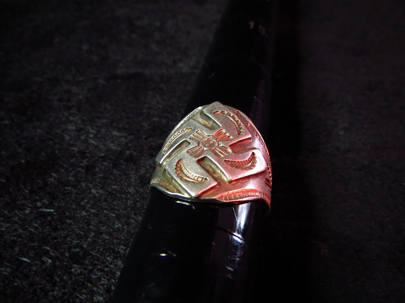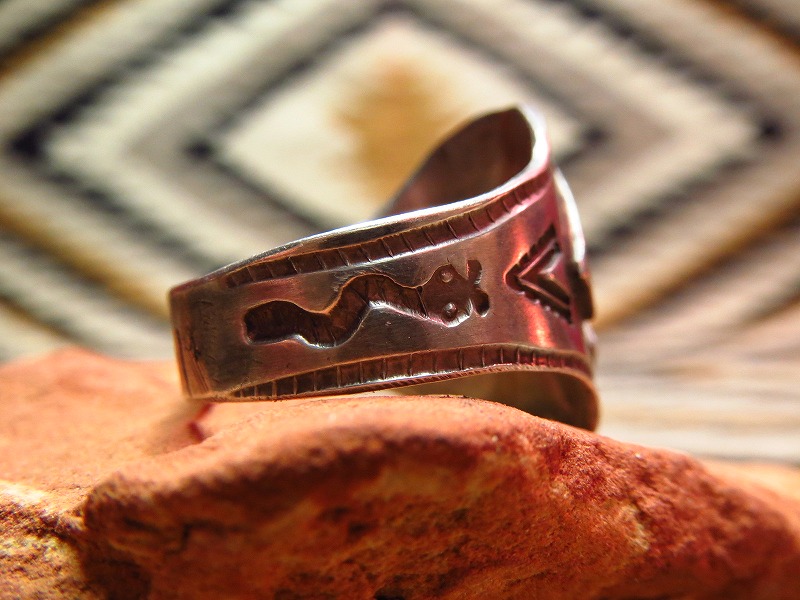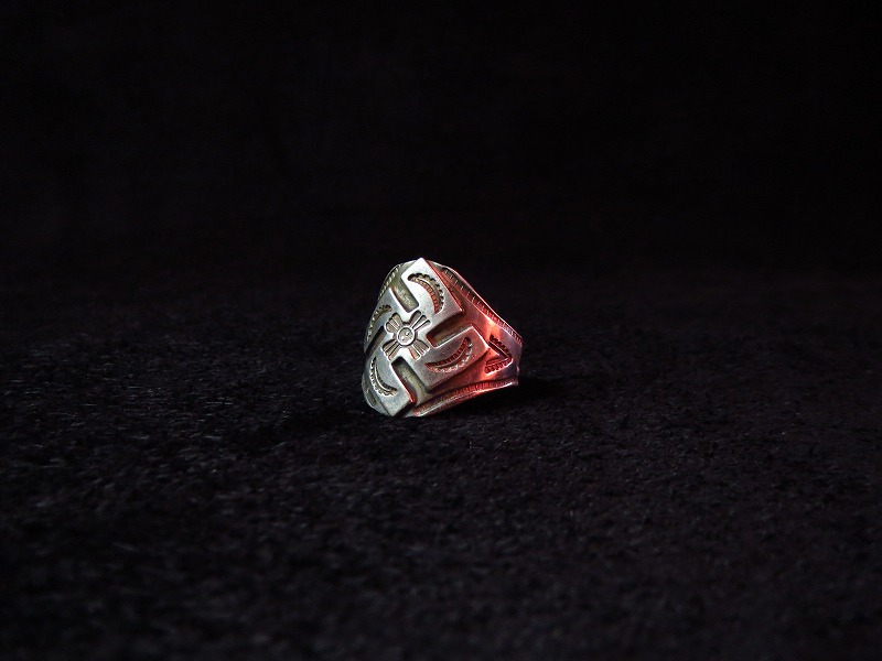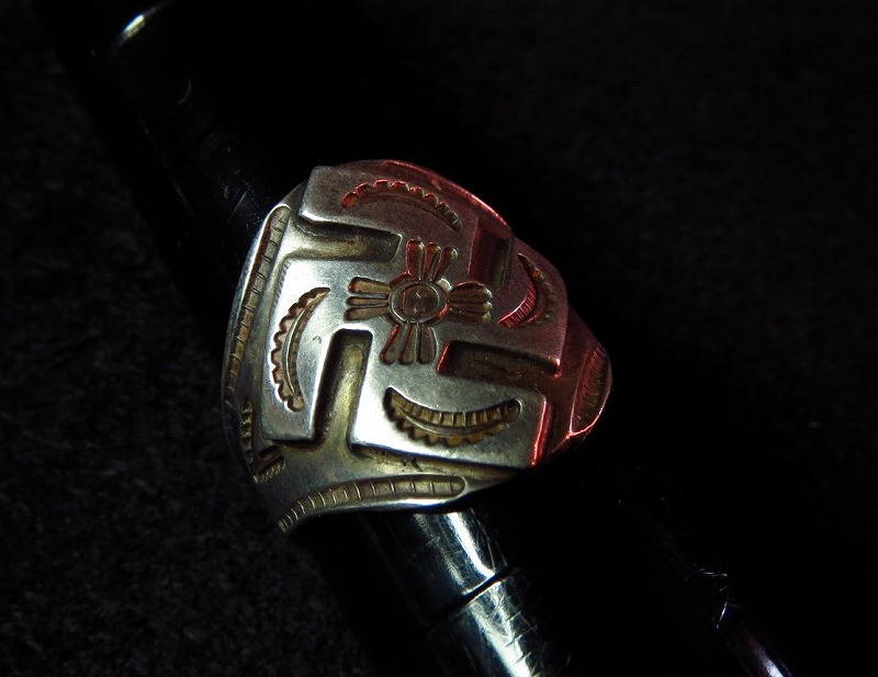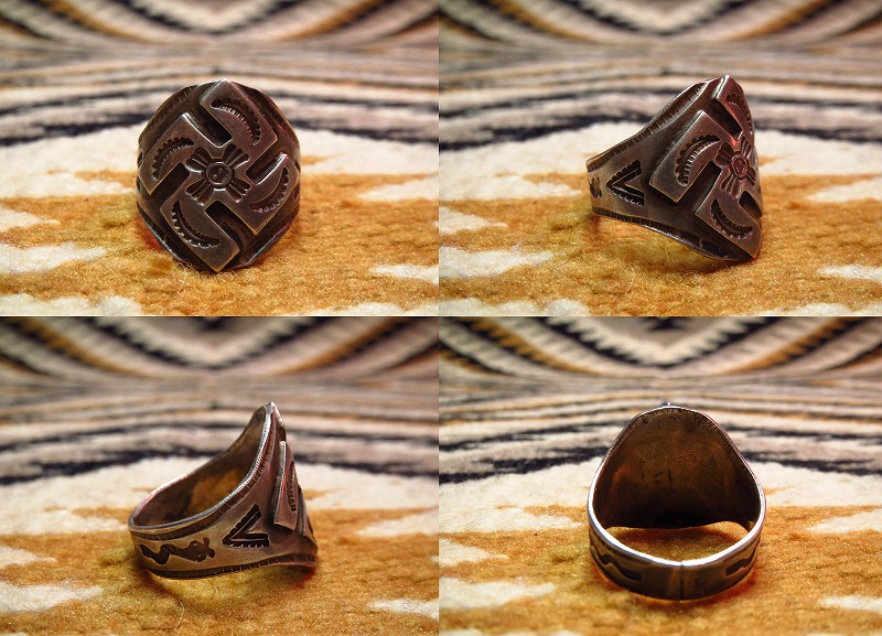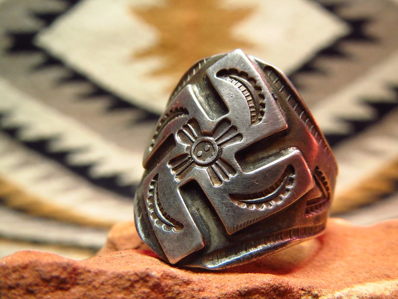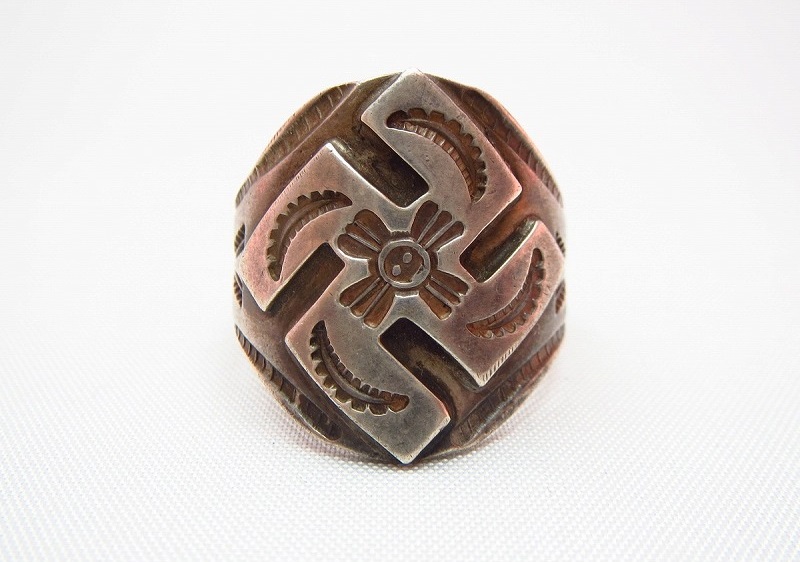 1930年代頃の卍パッチワークリングです。センターには太陽を表すシンボル、サイドにも蛇の美しいスタンプが施されています。
