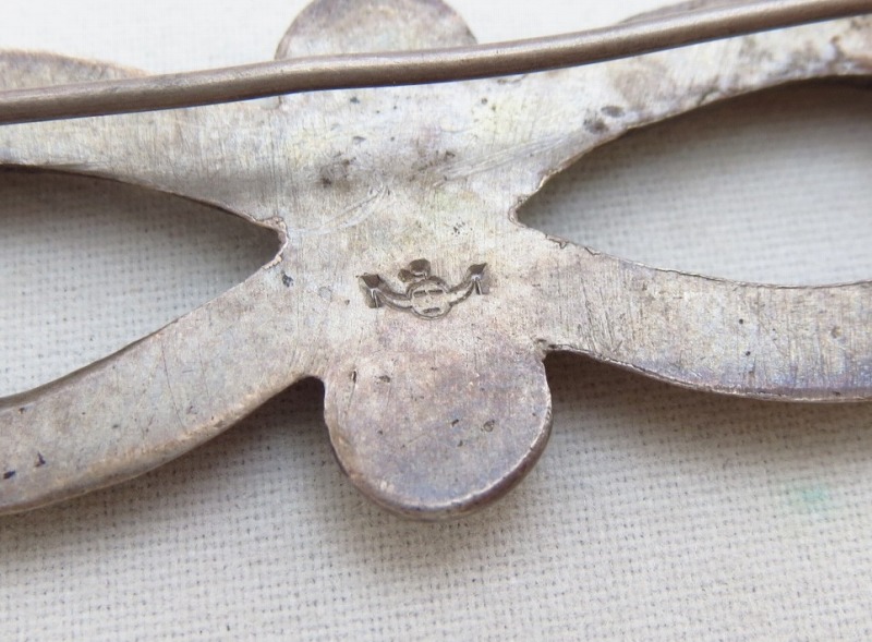 こちらの作品にも前述のホールマーク 【Horned Moon】が刻印されており、作者個人を特定することはできませんが、非常にナバホギルドらしいシンプルで洗練された造形のピンブローチ。当時、インディアンジュエリー創成期のリバイバル作品制作をメインとしたナバホギルドですが、やはりその完成度や古典を踏襲しながら新しいクリエーションを含んだ作品群は、アンティークよりもクリーンで練り上げられた造形美を持っています。