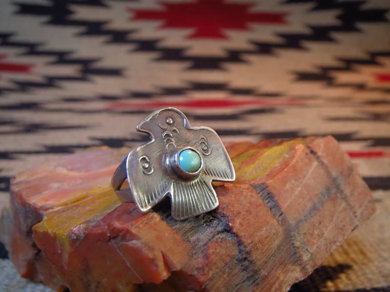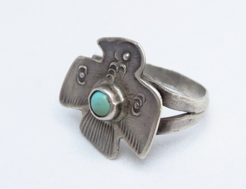 おそらくインゴットシルバー(銀塊)から成形されており、伝統的なスプリットシャンクにサンダーバードシェイプのフェイスで構成されています。サンダーバードの翼などディテールを表現しているスタンプ(鏨)は、おそらくサンダーバードを描き出す一つのスタンプだけで刻まれていると思われます。サンダーバードモチーフの作品では、全体的にポップな雰囲気を持つピースが多く見られますが、こちらは特に可愛さのある素朴なサンダーバードになっています。またそのような可愛さと共にスプリットシャンクやターコイズのベゼルなど、細かなディテールも全てプリミティブな技術のハンドメイドで制作されており、武骨で少し荒い部分も含めアンティークらしい表情と質感を感じされるリングです。