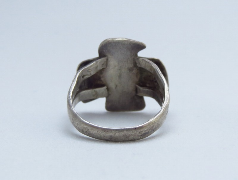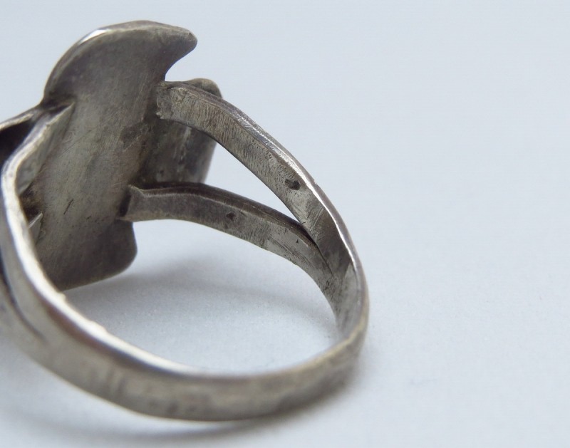 こちらの作品も、フェイスのサンダーバードがキャッチーでアイコニックな造形ながら、アンティーク独特の重厚な雰囲気も感じさせ、その長い年月を経た質感によって大人向けのアイテムに昇華されていると思います。また、女性に向いた小さいサイズですが、男性のピンキーリングにもお使いいただけると思われます(10~10.5号程度)。