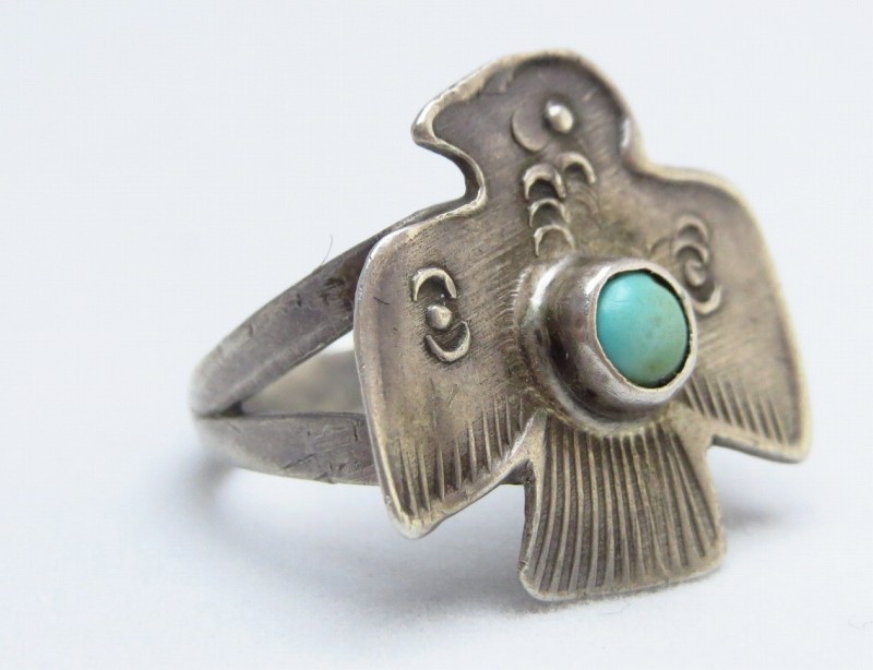 【NAVAJO】ナバホの【Tourist Jewelry】ツーリストジュエリーと呼ばれる、1910年代~1950年代のサウスウエスト観光産業の隆盛に伴って観光客向けに制作されたスーベニアアイテムの一つで、キャッチーで可愛いサンダーバードのフェイスが印象的なアンティーク/ビンテージリングです。