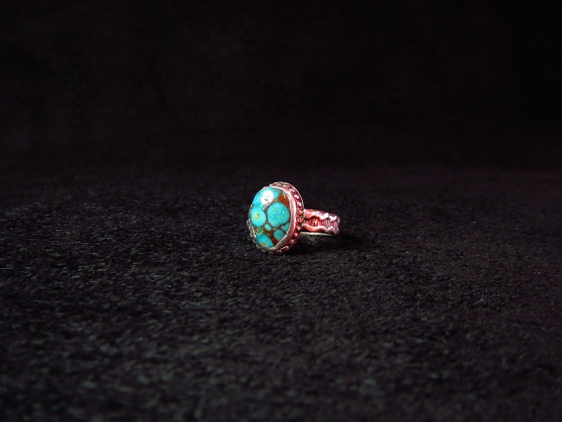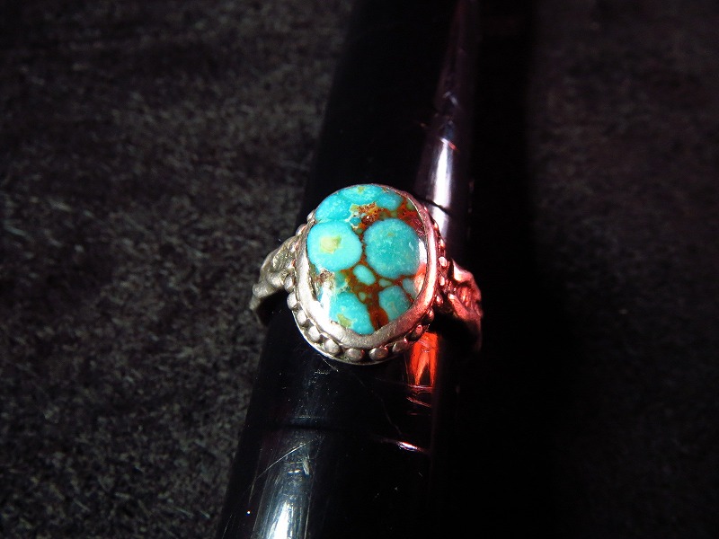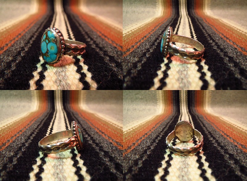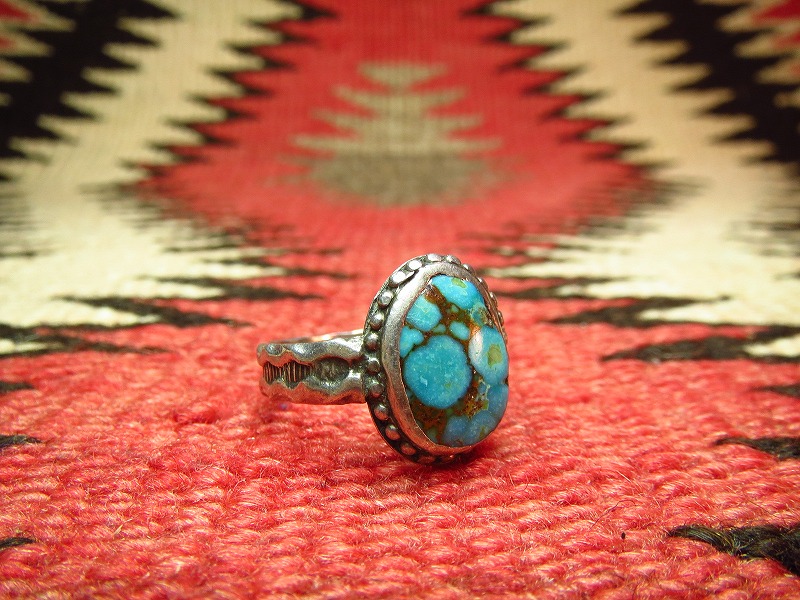 ナバホのOLDPAWN、美しいターコイズの印象的な作品で、オールドスタイルながらシャンクのスタンプなど手の込んだ作品です。