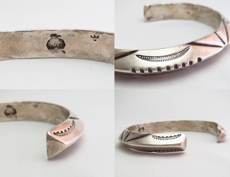 【Mark Chee】マーク・チーは、1914年にアリゾナ州ルカチュカイで生まれ、やはりインディアンスクールの彫金クラスにおいて、シルバースミスとしての技術を学んだようです。 若いころは、【Julius Gans Southwestern Arts and Crafts】=【Ganscraft】ガンズクラフト社に在籍していたり、Frank Pataniaの経営する【Thunderbird Shop】で石のカッターとして所属していた記録が残っています。1930年代末頃には、San Juan Puebloの女性【Santana Montoya】と結婚し、そこで、キワ(サントドミンゴ)の巨匠【Julian Lovato】ジュリアン・ロバトに出会っています。1940年代の初めには第二次世界大戦のため従軍し、エアフォースに所属していました。そして、1946年になってニューメキシコ州サンタフェに戻り、シルバースミスの仕事を再開、Al Packard経営の【Chaparral Trading Post】に在籍していたようです。1950年代には、非常に熟練した技術を持つシルバースミスとして高く評価されるに至り、その技術はナバホのトラディッショナルスタイルだけにとどまらず、ターコイズインレイやシルバービーズを用いたジュエリー等、多岐にわたる技術を身に付けていました。1960年代~70年代にはアートショーにおけるアワード受賞リボンを多数獲得しています。