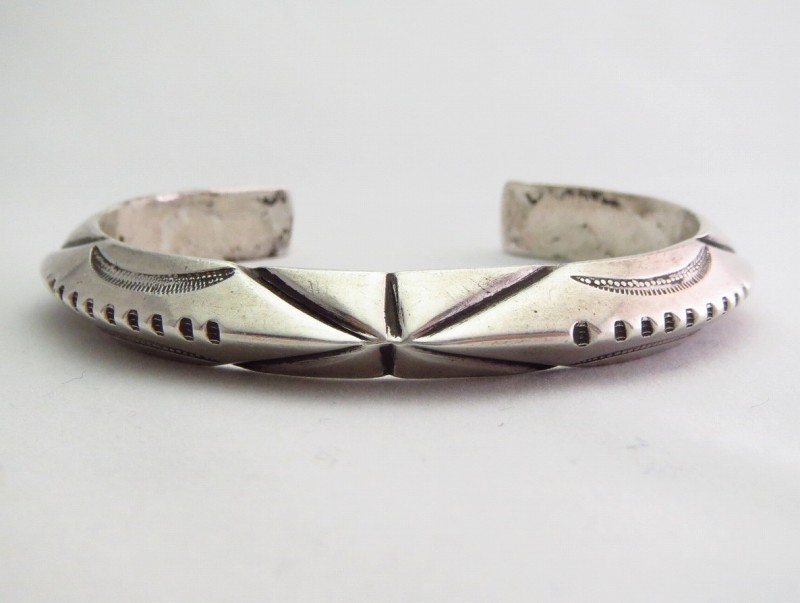 重厚なトライアングルワイヤーの全体に武骨ながら緻密なスタンプワークとファイルワークが施されており、特にエッジに刻まれたスタンプ(鏨)はライン模様を含んだスタンプをラインの方向に合わせ、連続して刻みことでシルバーの内側にライン模様を内包したような奥行きと立体感が生み出されています。現代でも【McKee Platero】マッキー・プラテロ氏等がこちらのようなスタンプの技術を受け継いでいますが、腕の良い作者に共通したディテールだと思います。