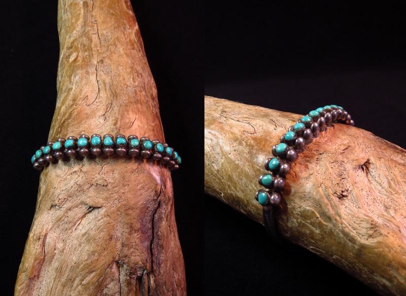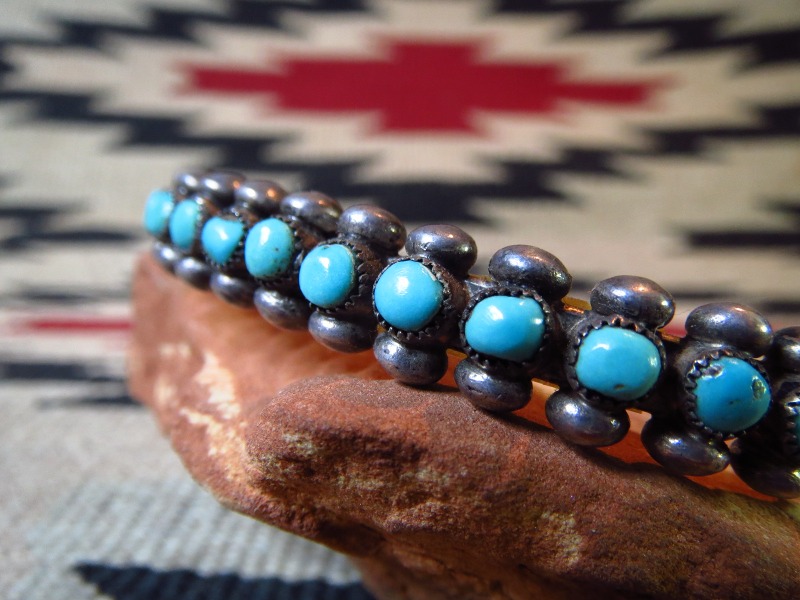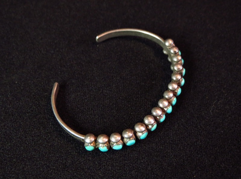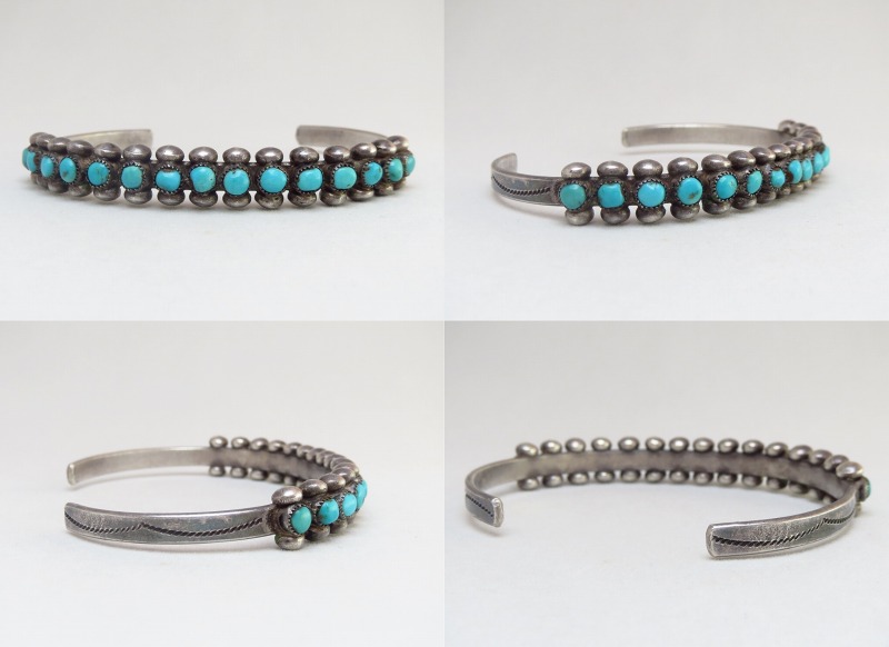 【ZUNI】ズ二のビンテージジュエリー、15個もの小さなラウンドカットターコイズが羅列された『ローワーク』と呼ばれる造形のピースで、それらの上下にはシルバードロップ/ボールが精密に配されたオーセンティックなスタイルのアンティーク/ビンテージバングルです。