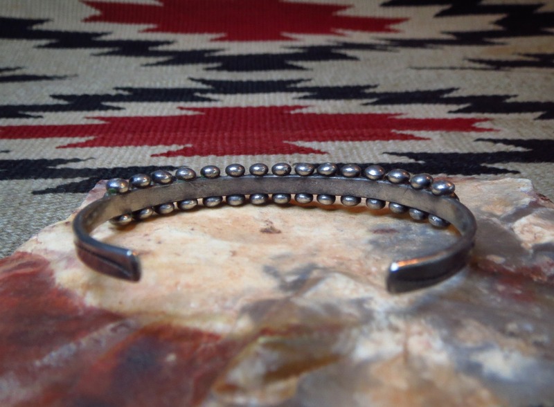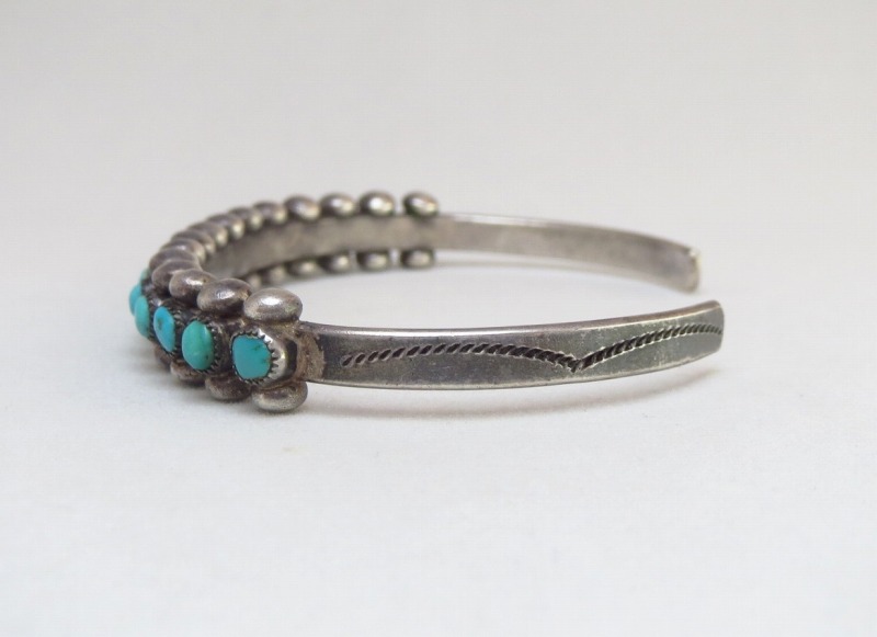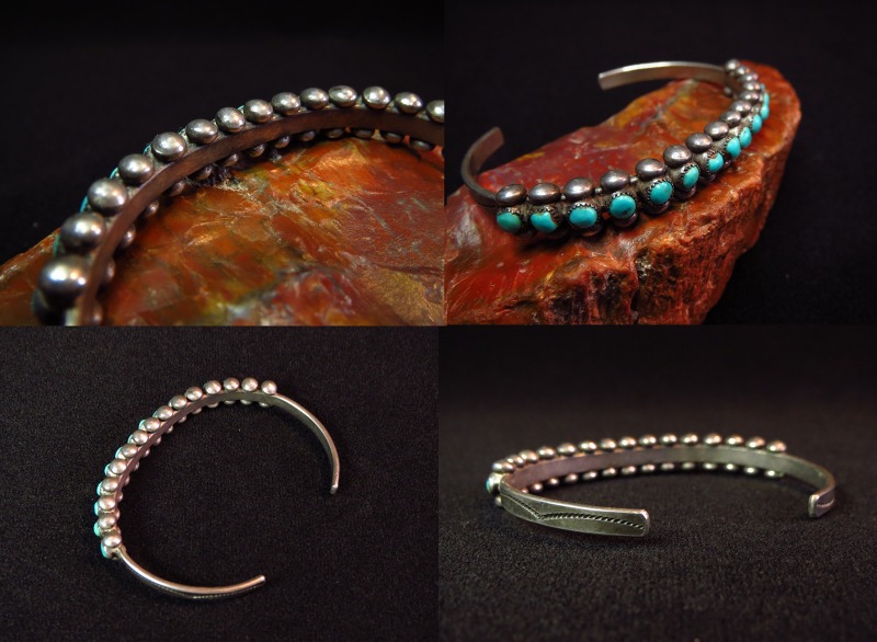 ズニの伝統的なスタイルのバングルで、細い幅のバンド/地金をベースにしていますが、高さのあるターコイズや比較的大きなシルバードロップにより、独特なボリューム感としっかりとした質感を持ち、スタッズのようなドットの羅列は、エッジーで洗練された造形美を作っています。