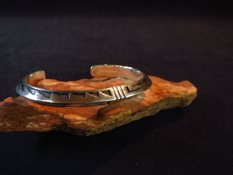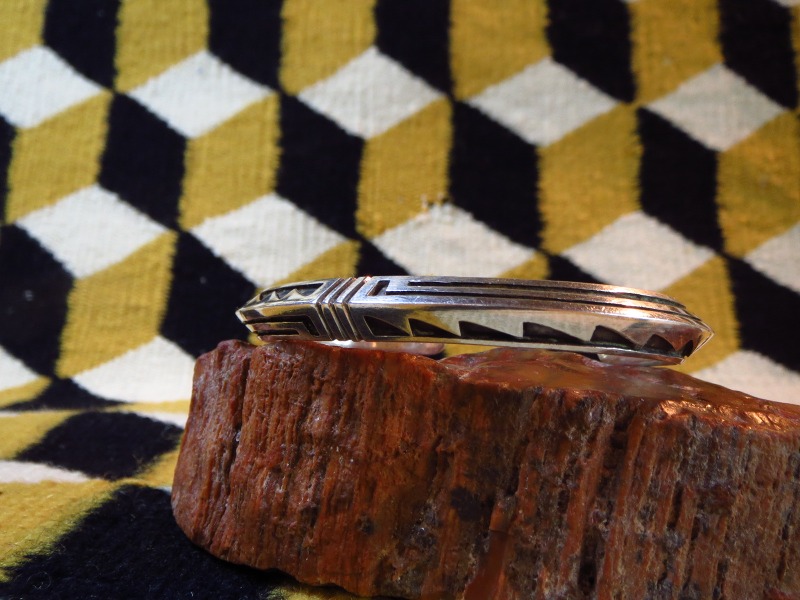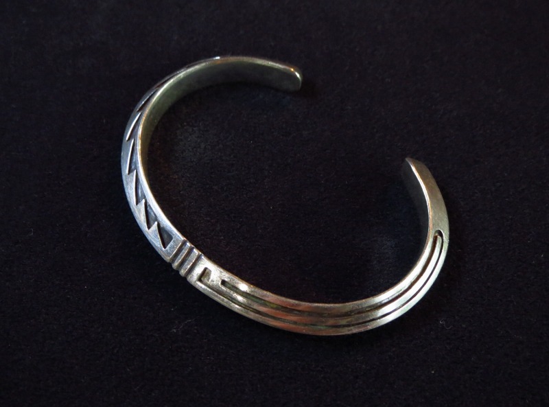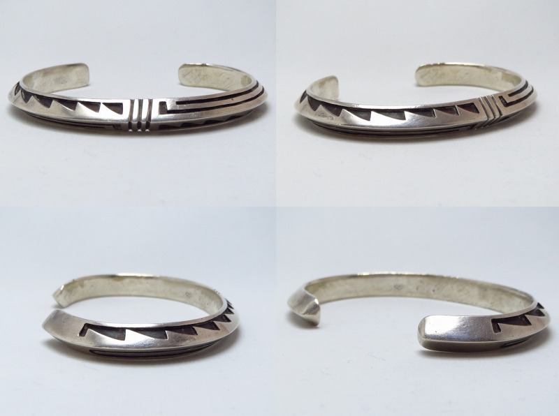 ホールマーク(作者のサイン)や造形スタイルなどから1960年代頃の作品と思われ、7~8㎜という幅はそれなりに重厚で大胆なカッティングによるオーバーレイがシンプルながら力強い印象を与えます。ベースとなっているトライアングルワイヤーもコマーシャルワイヤー(既製品)ではなくインゴットシルバー(銀塊)から成形されており、現代のホピジュエリーに比べて非常に分厚いシルバーがオーバーレイされています。オーバーレイのデザインモチーフはおそらく『水』や『虹』を表すものと思われ、同作者のクラン(氏族)にも関係し、農耕民族であるホピの人々にとっての命に直結する題材を表現しているようです。