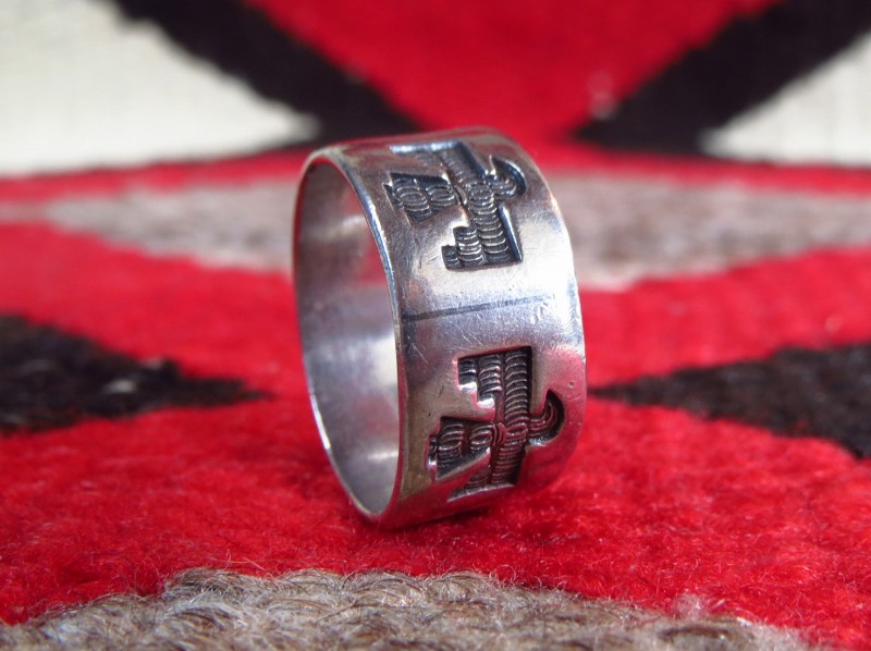 とても程よいボリューム感のリングで、サンダーバードが連続で施されたシンプルながら大変センスの良いピース。サンダーバードには細かなテクスチャーも刻まれ、インディアンジュエリーらしい奥行きがもたらされています。また、シンプルでオーセンティックなデザインは現代的な印象も持っていますが、シルバーの肌や武骨な質感などはビンテージ独特の味わいが感じられます。一部の工程には機械が用いられているため、マシン&ハンドメイドのハイブリッドなピースであり、ある程度量産されたリングですが現在では希少な物となっています
