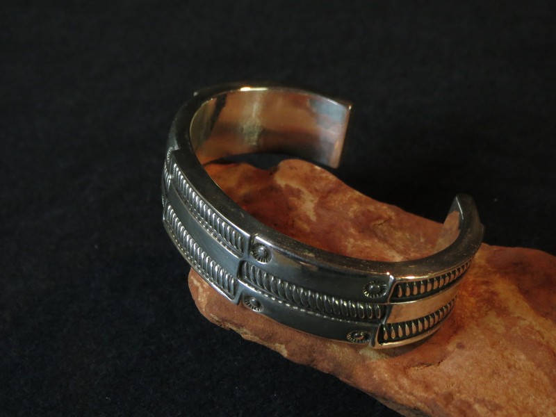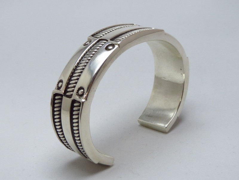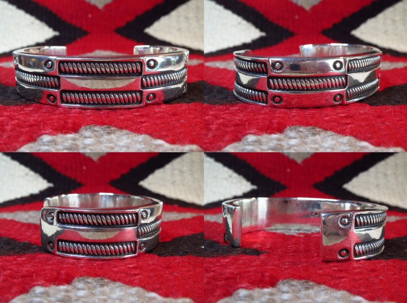 丁寧な仕事によるシルバーの肌は素晴らしい着用感を生んでおり、100gという重量も腕へのなじみにより苦にならないと思います。また、洗練されたデザイン/造形と、力強く刻まれたスタンプワークやプリミティブなシルバーワークによるナバホジュエリーらしい力強い表情はスタイルを選ばずお使いいただけると思われ、長年にわたってご愛用いただける普遍的な完成度を持った作品です。