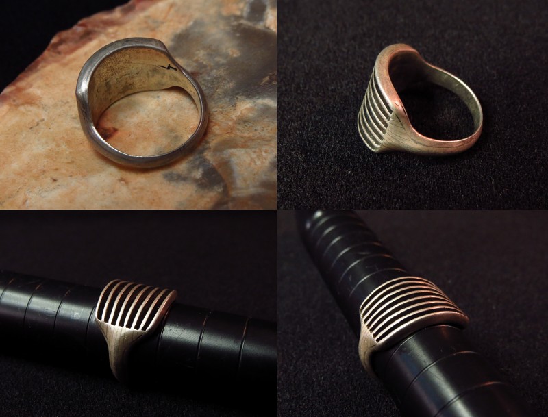 1970年代後半~1980年代頃の作品と推測され、内側にはLeroy Thomasの『L』と『T』が一つに構成されたホールマーク(サイン)が刻まれています。White Hoganのショップマークなどは施されておらず、同ショップに在籍していた時期の作品かは不明ですがモダンナバホジュエリーを提案・展開していたWhite Hoganらしいエッジーでシンプルで完成された造形美を持ったリングです。