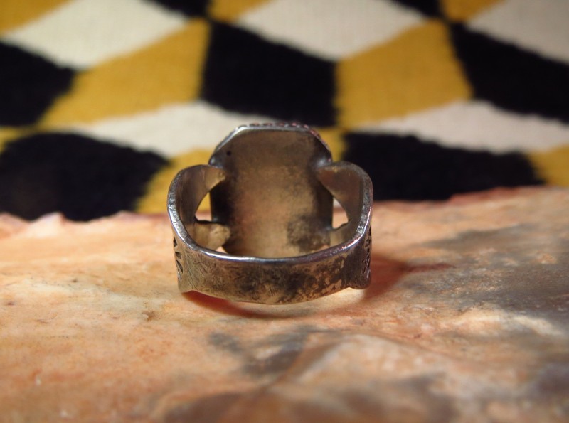 ナバホのトラディッショナルな伝統的技術を守りながらも独創的なデザインに仕上げられ、ビンテージ作品としては突出した造形センスを感じさせる作品。アンティークインディアンジュエリー特有の質感と奥行きとを持ち、類似したピースを発見するのが困難なデザイン/造形のピースです。また、普遍的な造形美を持ち、長年にわたってご愛用いただけるアンティークリングだと思われます。