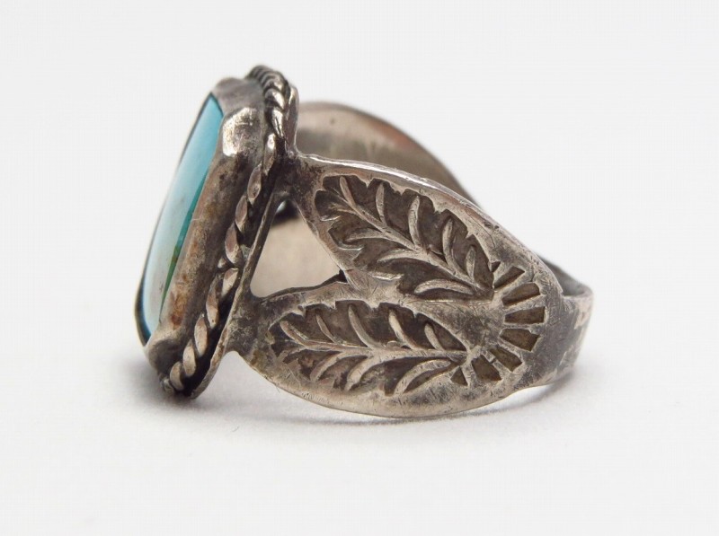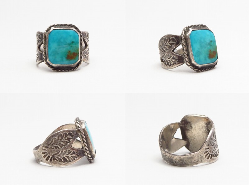 ベゼルには細いツイステッドワイヤーが配され、シャンクは上記の様なスタンプワークに合わせるようにカッティングが施されています。これらの味わい深いシルバーワークと素晴らしい造形センス、さらにクオリティーの高いオールドブルージェムターコイズにより構成されたアンティークの良作です。