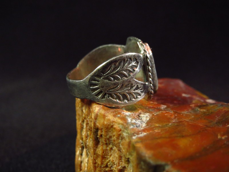 また、その土台となっているシャンクはスプリットではなくカッティングによって独特なシェイプとボリューム感を持った造形になっています。さらに、そのサイド部分にはおそらくリーフ/たばこの葉がモチーフと思われるスタンプが刻まれており、こちらの様な有機的なスタンプデザインや柔らかな曲線を持ったシェイプ、ナバホのトラディショナルな技術を使いながらも特別な個性を持ったデザインなどから、【ZUNI】ズニや【HOPI】ホピ、【Kewa】キワ(サントドミンゴ)などを含む【PUEBLO】プエブロの職人による作品である可能性を高めていますが、やはりナバホの職人による作品である可能性も否定できません。