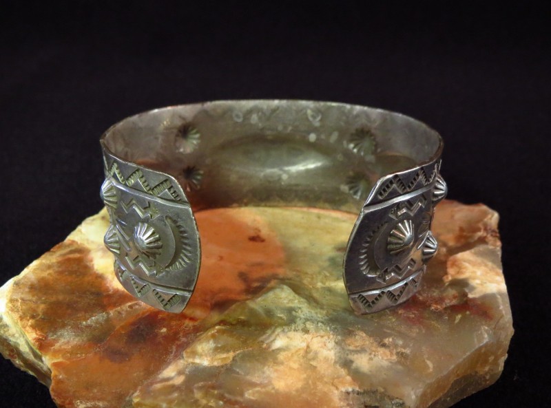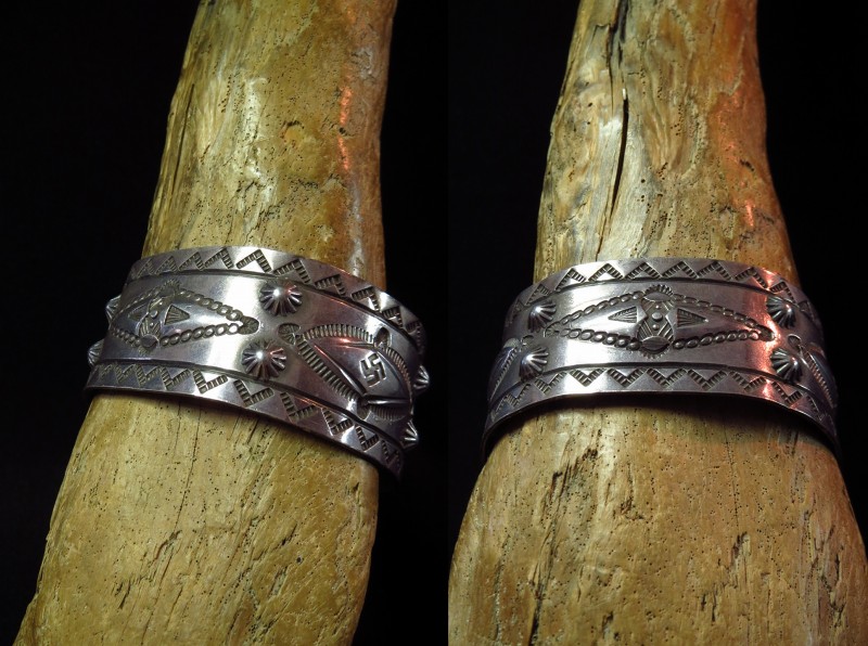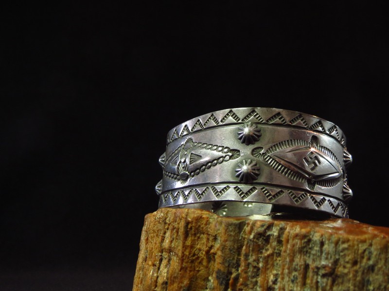 【Fred Harvey Style】フレッド・ハービースタイル、【Tourist Jewelry】ツーリストジュエリーと呼ばれる、当時アメリカ中西部の観光客向けに制作されたピースで、【逆卍】Whirling Logやイーグルフェザー、ライトニングスネーク等、多くのモチーフが全体にスタンプされたアンティーク/ビンテージワイドバングルです。