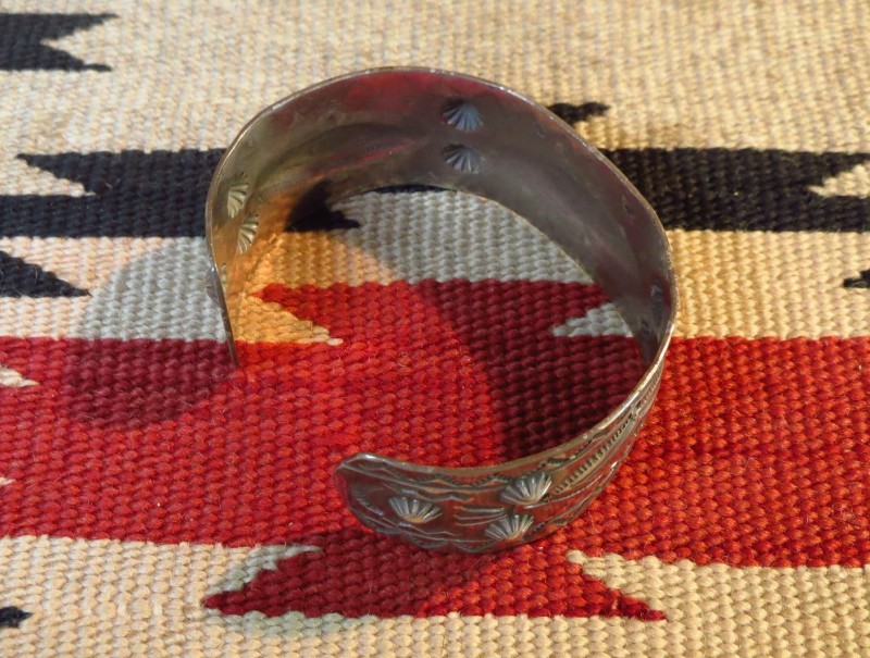 ワイドな幅で立体的なリポウズが施されることで迫力と存在感のあるバングルに仕上がっていますが、ターコイズのセットされていないプレーンシルバーのみの構成と武骨でビンテージインディアンジュエリーらしいシルバーの質感によって派手さのない渋い印象のバングルとなています。また、全体に刻まれたスタンプワークにより、ナチュラルで奥行きのある質感をもたらされており、多くのスタイルに馴染みやすい表情に仕上がっています。