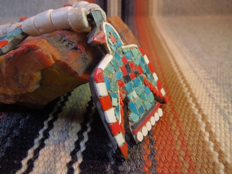 こちらの作品の様にサンダーバードの内側にレインクラウドが描かれたデザインは、古いチマヨのブランケットにもみられるパターンであり、やはりニューメキシコ州北部のプエブロにおいて重要視されたモチーフであることがわかります。