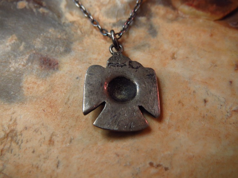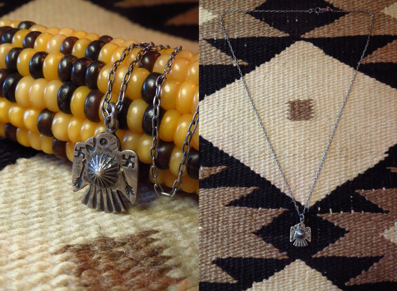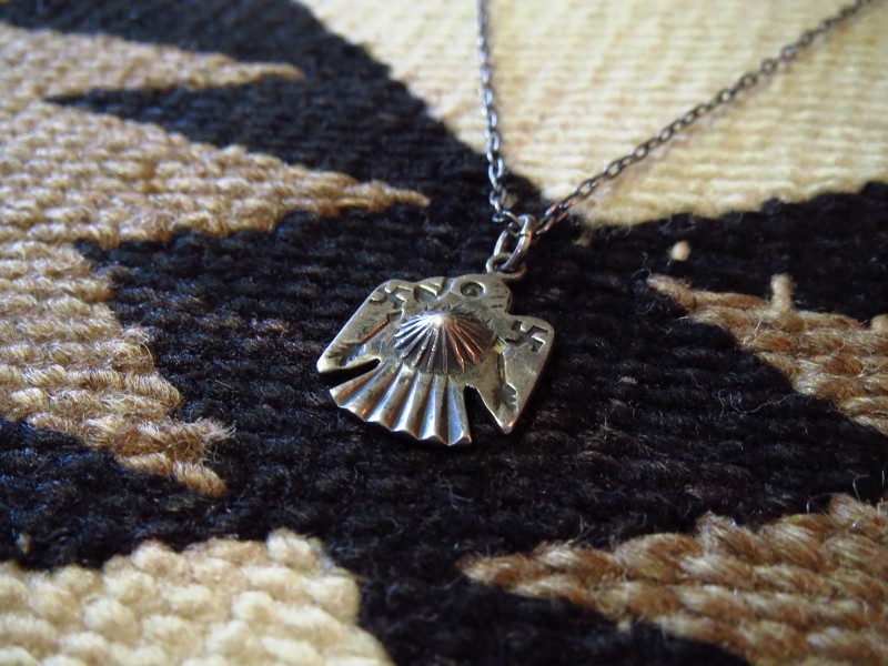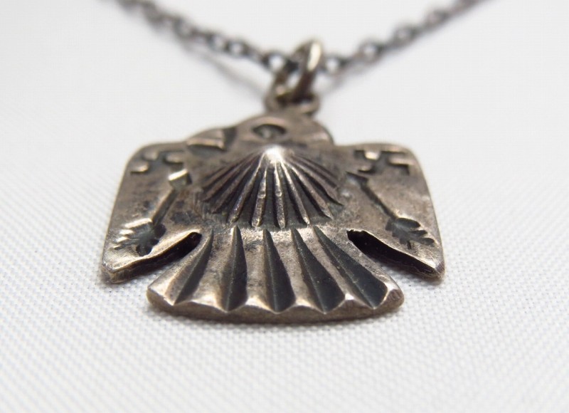 【NAVAJO】ナバホの【Tourist Jewelry】ツーリストジュエリー、【Fred Harvey Style】フレッド・ハービースタイルとも呼ばれる1910年代~1950年代当時に、観光客向けに制作されたアイテムの一つで、サンダーバードシェイプに卍やアローのスタンプが施された小さなトップのアンティーク/ビンテージネックレスです。