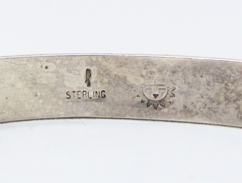 ダレン・サイラス氏は現在も活動されている作家ですが、こちらの作品はキャリア初期のピースと思われ【Hopi Silvercraft Cooperative Guild】ホピシルバークラフト コーポレーティブギルド(通称ホピギルド)に在籍していた時期の作品であり、裏側には氏のホールマーク『Parrot/オウム』の刻印と共にホピギルドを表すホールマークである『Sunface』が刻まれています。