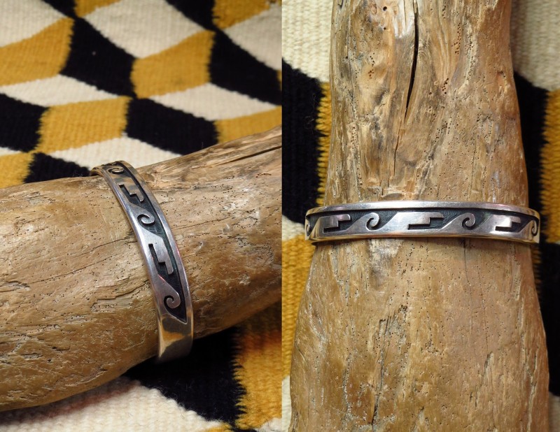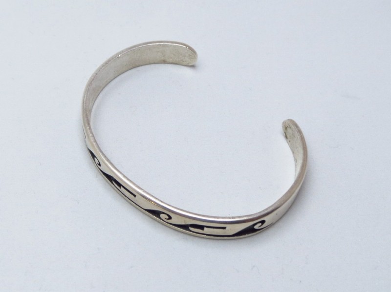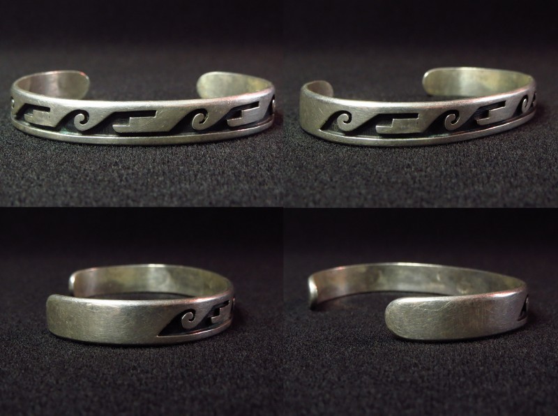 1990年代前半頃の作品と思われ、現在では非常に緻密なカッティングワークにより、サンフェイスやコーンフラワー、ココペリなど比較的具体的なモチーフを細かく描き出して表現することを得意とする作家ですが、こちらの作品は、多くのホピギルドで作られる作品と同じようにトラディショナルなオーバーレイ技術を用いたホピジュエリーのスタイルとなっています。独特なウォーターウェーブの紋様が描き出されたバンド(地金)は、古いオーバーレイ作品の特徴といえる、現代よりも厚いシルバープレートをカッティングし、逆に少し薄いシルバープレートをベースにしてオーバーレイされています。また、上下のエッジは丁寧に丸く鞣されており、とてもシンプルで素朴な印象を持っていますが、実際にはとても手間のかかるシルバーワークにより形作られており、細部にもこだわった仕上げとなっています。