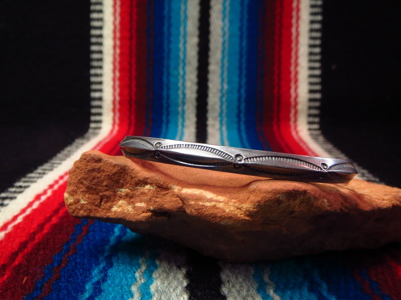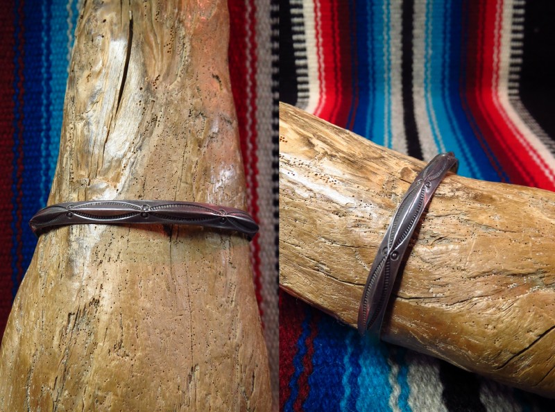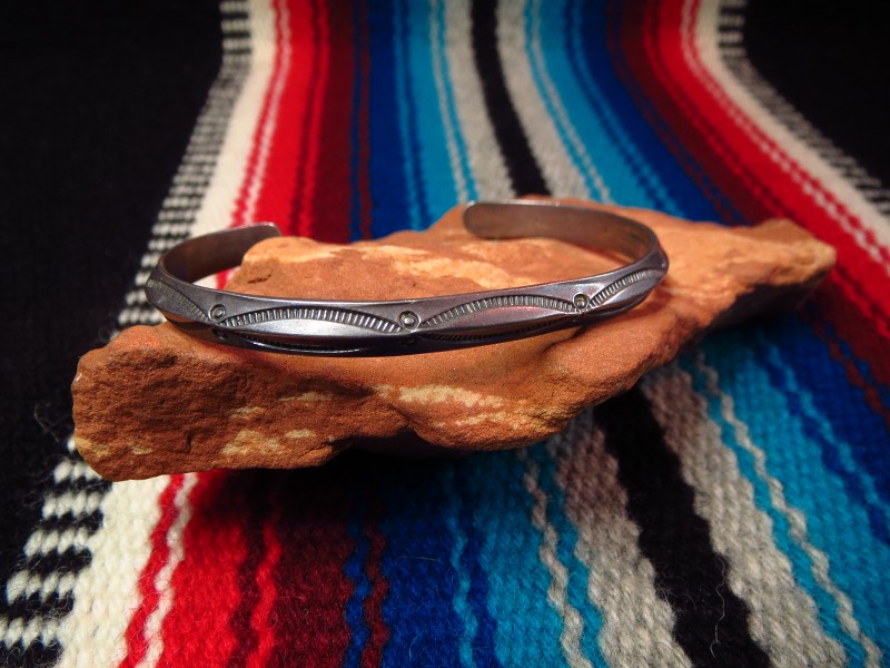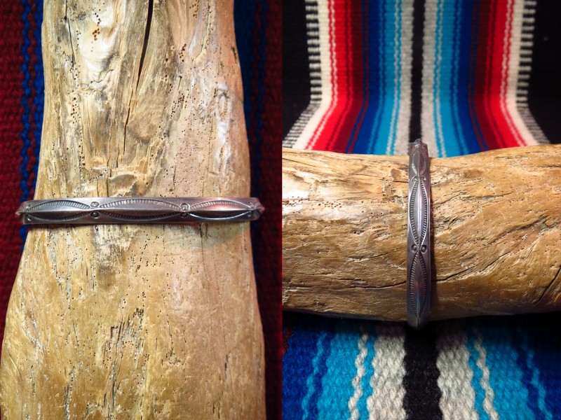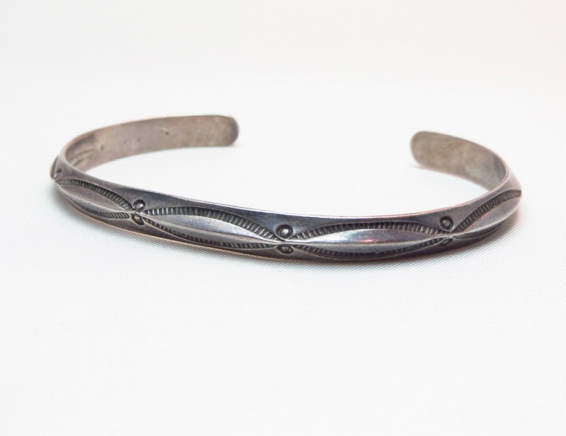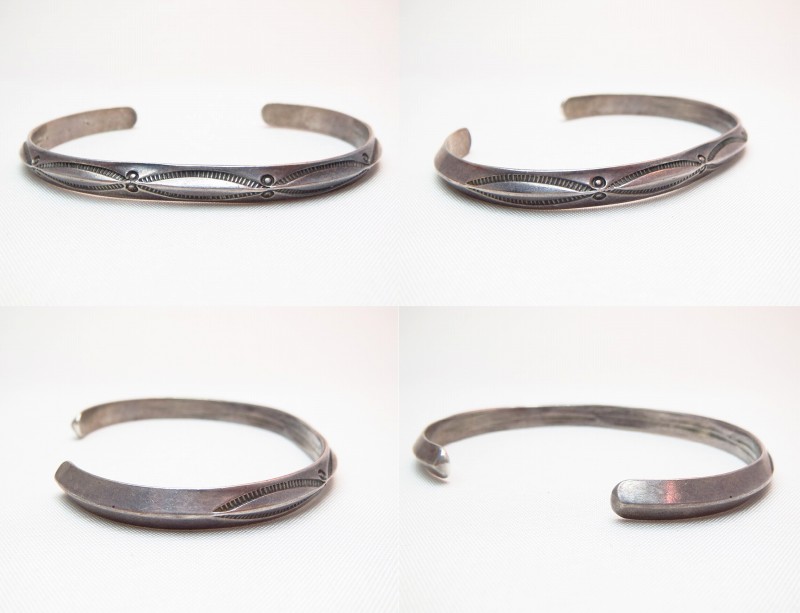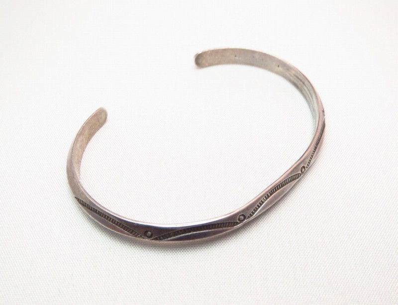 1950年代後半~1970年代頃に作られたと思われる作品で、ナローな幅のバングル。ナバホの伝統的な造形スタイルの一つであるトライアングルワイヤー(断面が三角形のシルバーワイヤー)をバンドに、シンプルながらビンテージらしいくクオリティーの高いスタンプ(鏨)によってシンプルでプリミティブな紋様が刻まれています。また、シルバーの肌は経年により黒っぽく変色し、ハンドメイドの武骨な表情など、ビンテージらしい風格を感じることが出来る作品です。