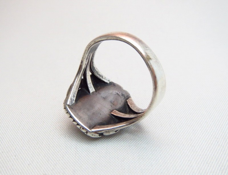 1940年代~1950年代頃に制作されたピースと思われ、おそらくインゴットシルバー(銀塊)から成形されたシャンクは『スプリットシャンク』と呼ばれる伝統的な造形で3本に割り開かれており、フェイスに向かって幅とボリューム感を持たせ、フェイスとの自然なつながりを作っています。ターコイズベゼルには、ツイステッドワイヤーが施され、細かなワイヤーワークによって三角形のターコイズを用いながらスクエアシェイプのフェイスを構成しています。さらに、フェイスとシャンクの接続部には、ハンマーによってフラットに叩きなめされたツイステッドワイヤーが配されており、小さなシルバーボールなども配されることで、リングとしてとてもバランスの良い造形に仕上がっています。