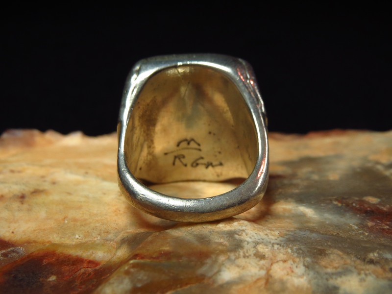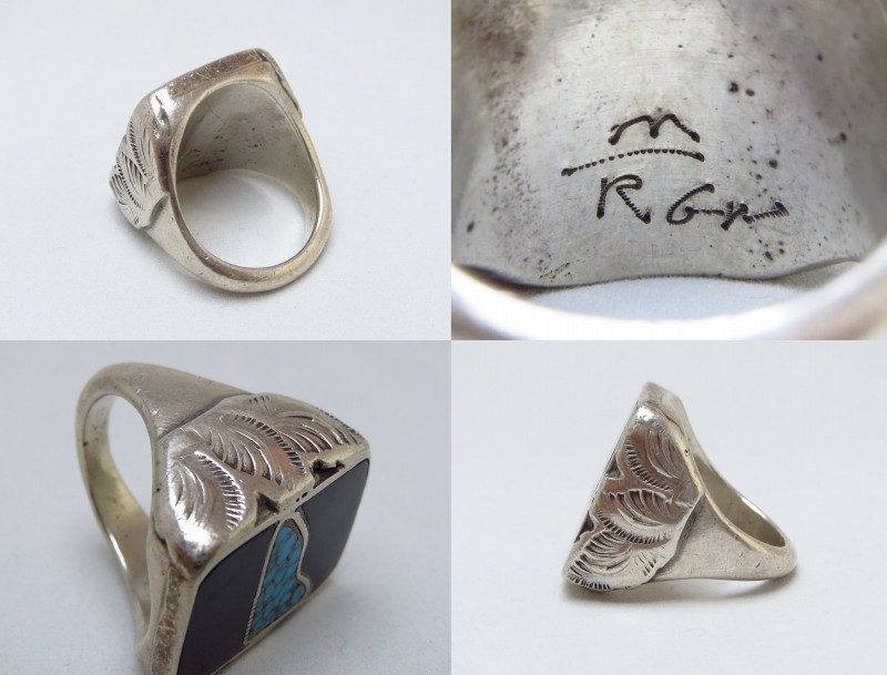重厚なリングの土台とシャンクはキャストで成形され、スクエアシェイプのフェイスには現代では見られない分厚いシルバーを使用してインレイのベースが作られています。上下と中央を3分割するような構成を抽象的な印象の曲線で作りだし、深淵なブラックのジェットを上下に配置することで中央の質の高いターコイズの美しさを一層際立たせているようです。さらに、サイドには同作者を代表するリーフモチーフがスタンプ/刻印されたアップリケが施され、クラシックな表情と作者の独創性の双方を強く感じさせる作品です。