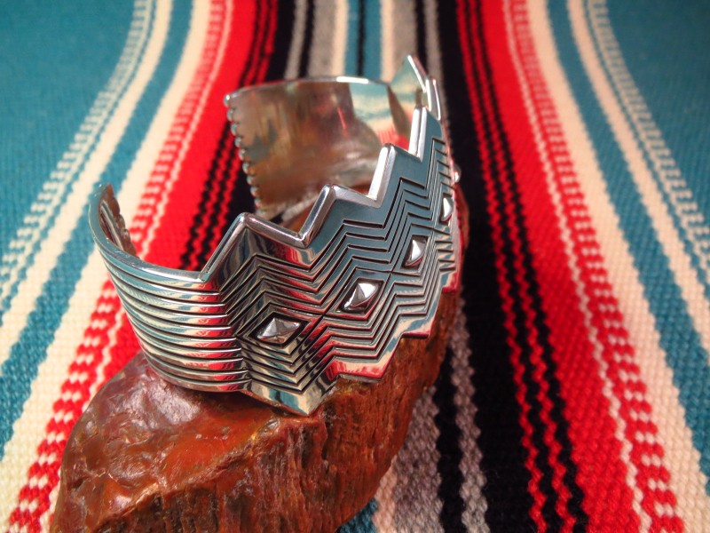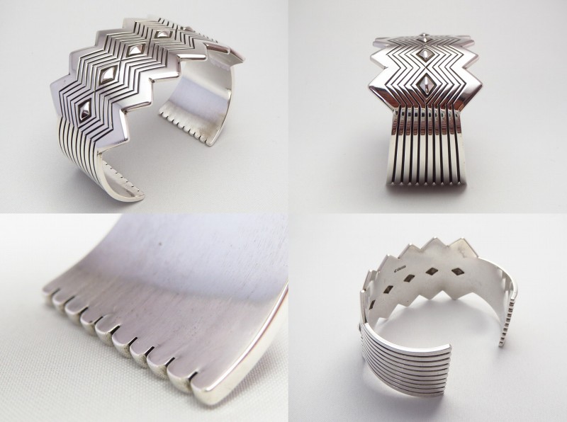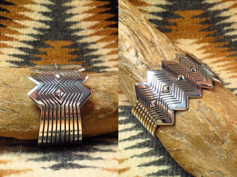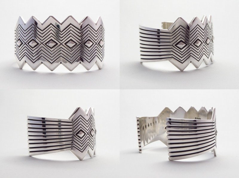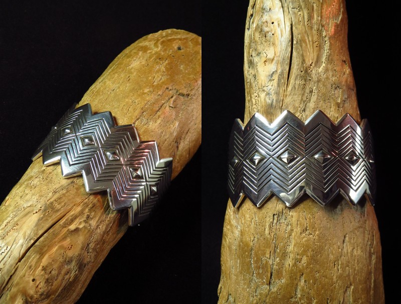 【NAVAJO】ナバホの巨匠【Thomas Curtis Sr.】トーマス・カーティス(1945-2013)の作品で、エッジをジグザグにカットし、そのシェイプに合わせたスタンプワークとセンターにはダイヤモンド型のリポウズが施された作品。巧みなシルバーワークで造り上げられ、グラフィカルで現代的な印象を持ったワイドバングルです。