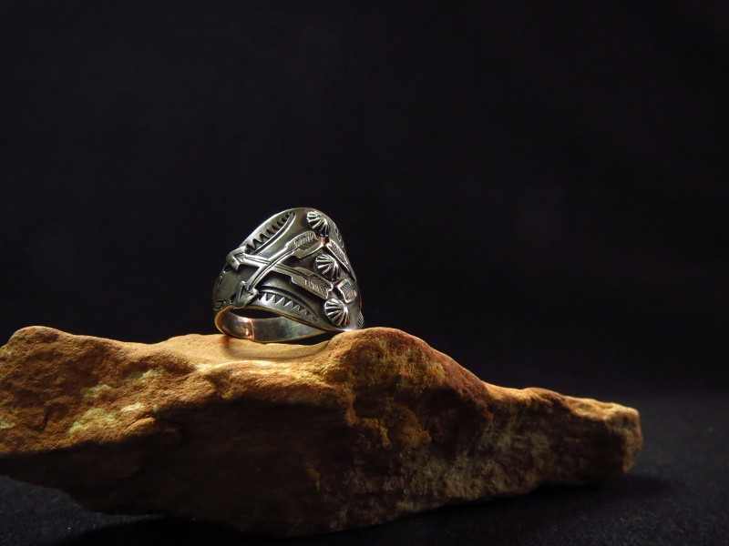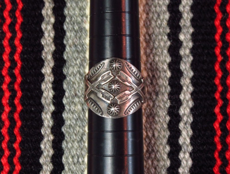 1920年代末頃~1940年代製と思われ、比較的希少なメンズサイズのリング。シガーバンド(葉巻に巻かれている帯のこと。現在は、ブランドが確認できるデザインが描かれているが、もともとは手袋や手に葉巻によるシミが付くことを防ぐ為に考案された帯)のシェイプに成形されたシャンクのフェイスに2つのクロスアローズをアップリケ/パッチワークし、センターには縦に3つのシェルコンチョがア施されており、これらは裏から叩き出したリポウズ/バンプアウトではなく、アップリケ/パッチワークで構成されています。さらに全体にスタンプワークによる紋様が刻まれ、複雑な表情とアンティークインディアンジュエリーらしい奥行きが与えられているようです。