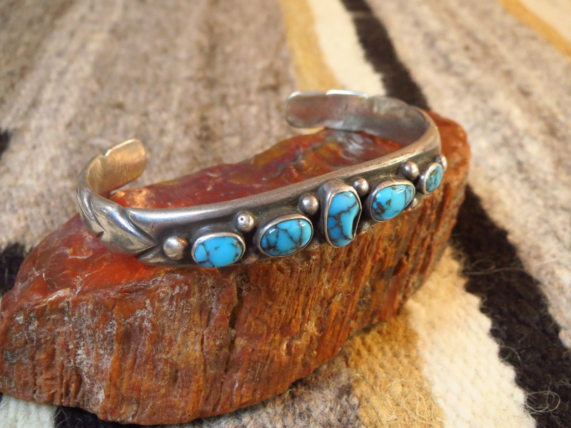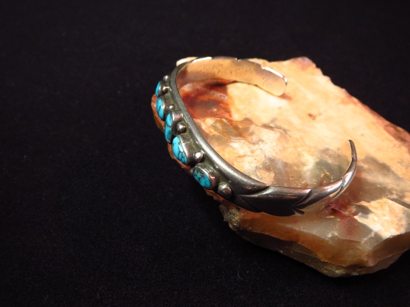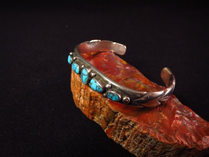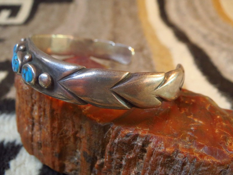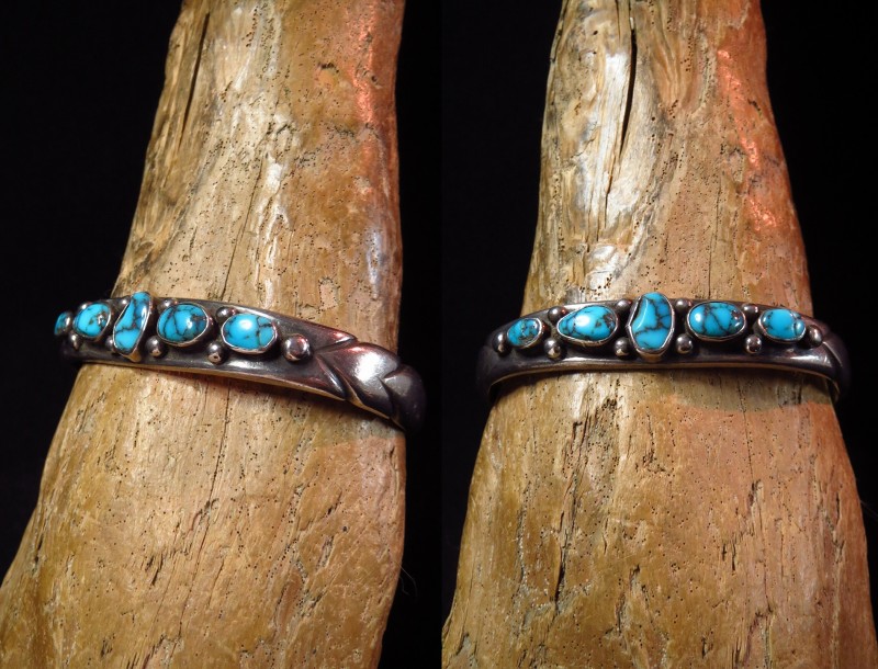 1940年代末後~1950年代頃に作られたピースと思われ、インゴットシルバー(銀塊)から成形された重厚なバンド/地金をベースにして、5つのターコイズがセットされています。このような石を連続して羅列した『ローワーク』と呼ばれるデザインは、ナバホのトラディショナルなスタイルの一つであり、とても男性的で威厳のある印象を持っています。さらに、それぞれ石の間と両サイドにはシルバーボールが配され、全てナバホの伝統的でオーセンティックなスタイルとディテールで構成されたバングルです。また、バンドのサイド~ターミナル(両端)には、ファイルワークと呼ばれるヤスリで削るプリミティブな技術によって深い溝のライン模様が刻み込まれ、原始的で粗野なシルバーワークながら効果的なアクセントになっています。これらのシルバーワークやハンマーワークで形作られた柔らかな印象のシェイプ等によって有機的でオールドナバホジュエリーらしい力強さがもたらされています。