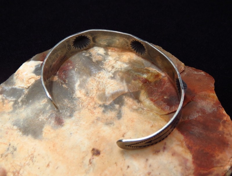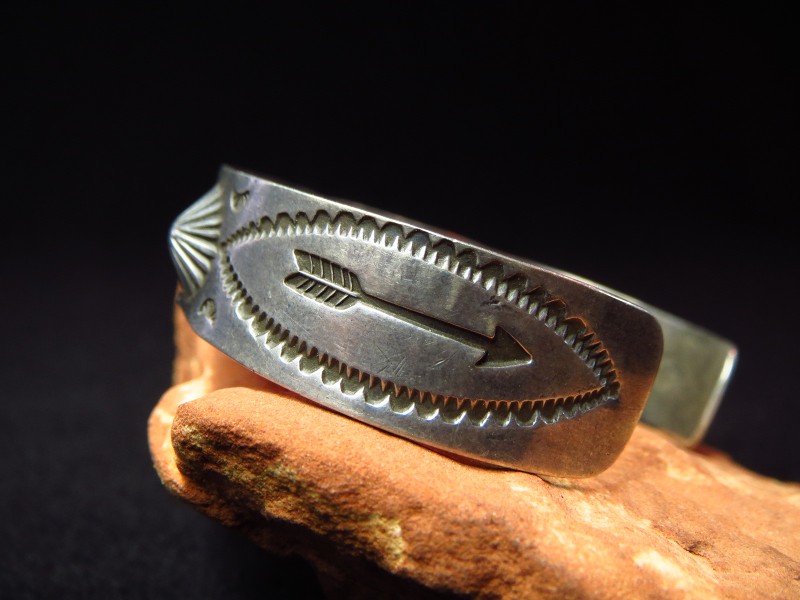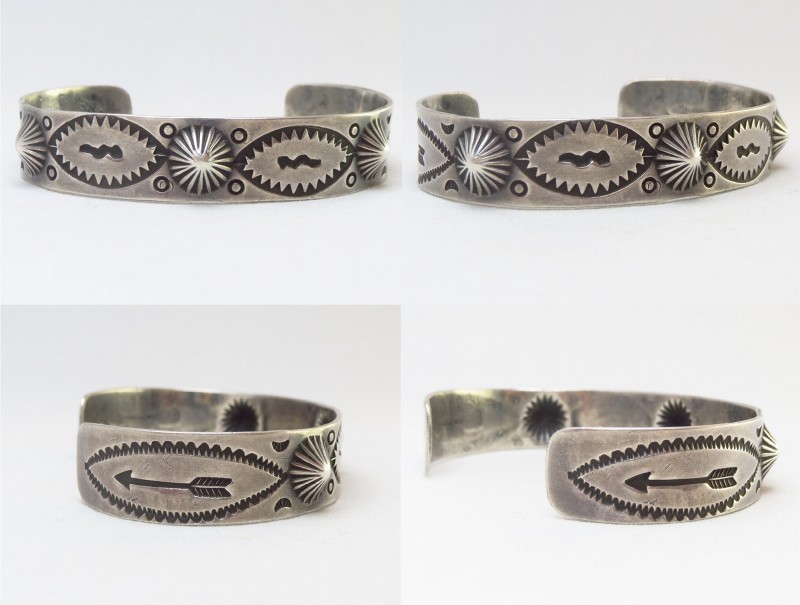バンド/地金もツーリストアイテムとしては比較的しっかりとしており、センターとサイドの3か所には、鏨(鉄製の金型ツール)の凸と凹を用いてシルバーを叩きだすことで立体的な凹凸を作る『リポウズ』が施されています。さらに、全体にスタンプワークが配され抽象的な紋様を構成するパターンのスタンプと共にスネークモチーフやアローのスタンプが刻まれています。また、スネークのスタンプを囲むように刻まれた文様はガラガラ蛇の顎を表すとされるスタンプです。