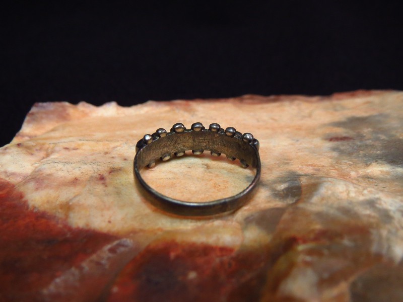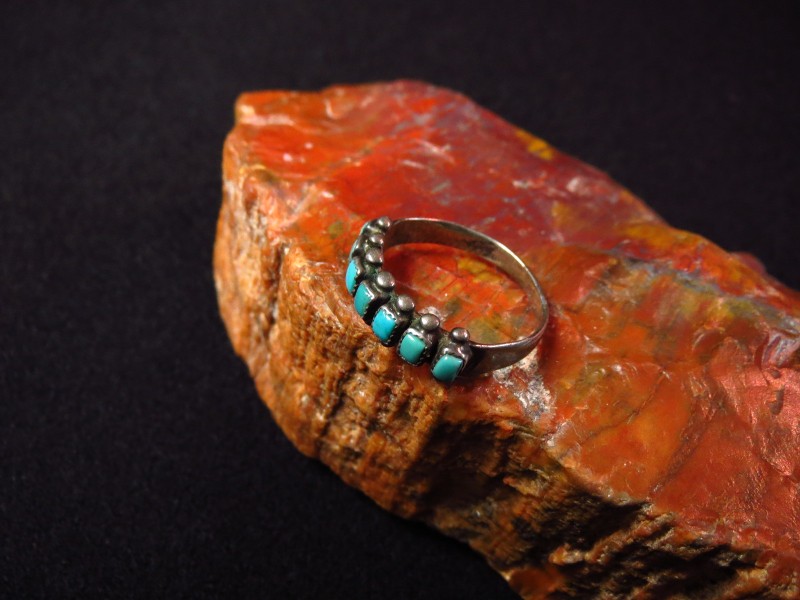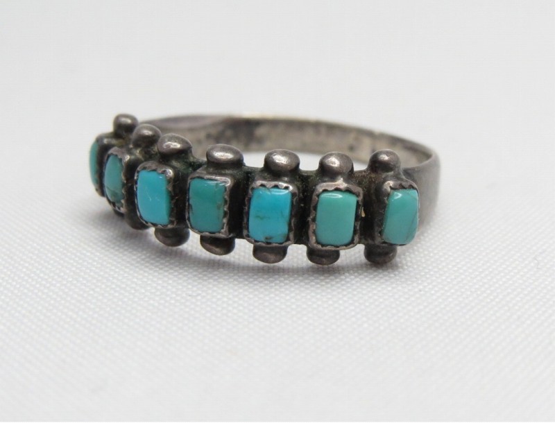 【ZUNI】ズニのビンテージジュエリー、ターコイズが羅列された『ローワーク』と呼ばれる造形スタイルの作品で、それらの上下にはシルバードロップ/ボールが精密に配されており、細部まで丁寧に仕上げられたナローなアンティーク/ビンテージリングです。