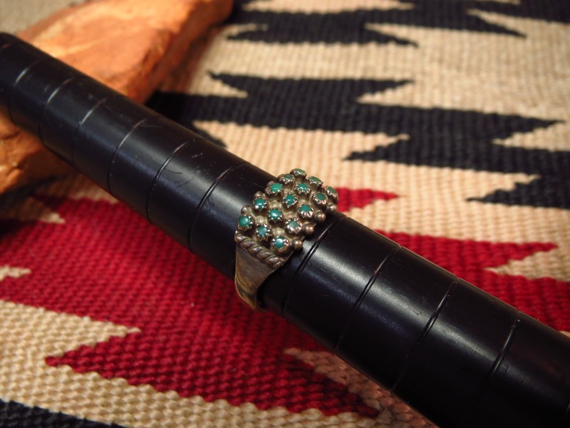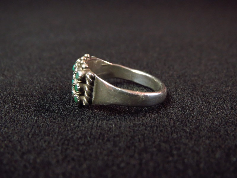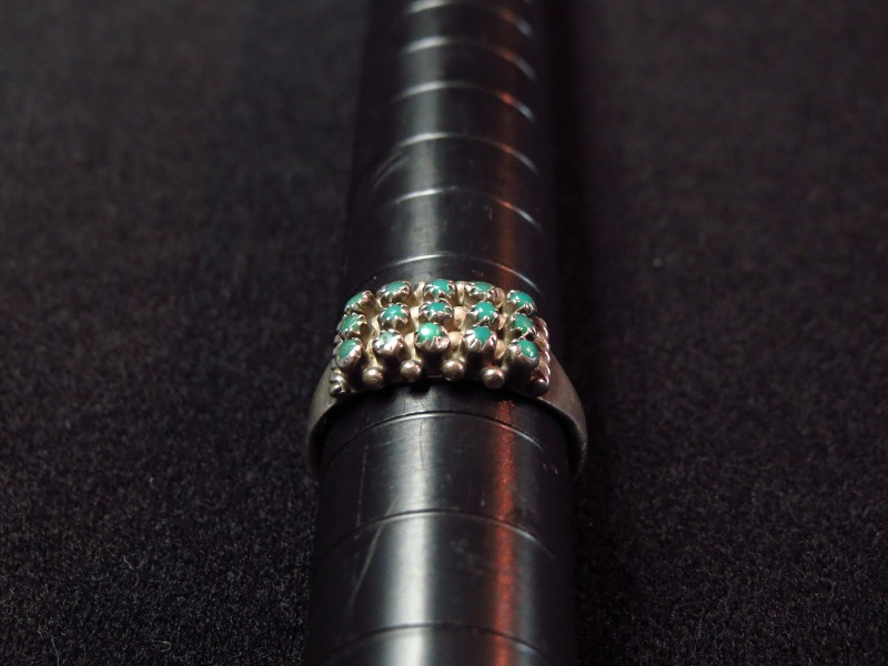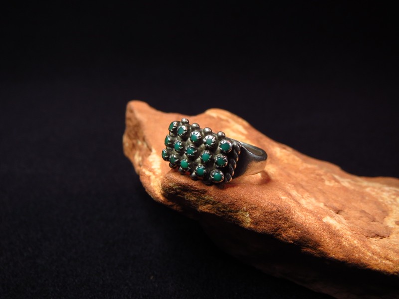【ZUNI】ズニのビンテージジュエリー、ターコイズを精密に構成した造形スタイルであるニードルポイントがメインになった作品で、それらの上下にはシルバードロップ/ボールが配されており、ズニ独特の技術で仕上げられた繊細な印象が特徴的なビンテージリングです。