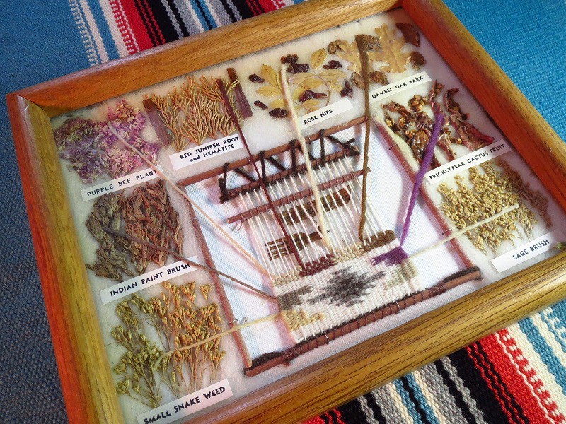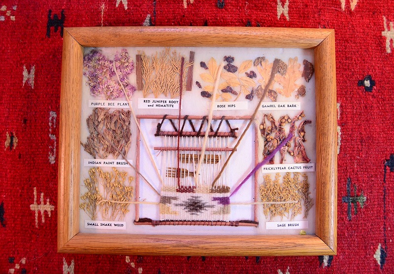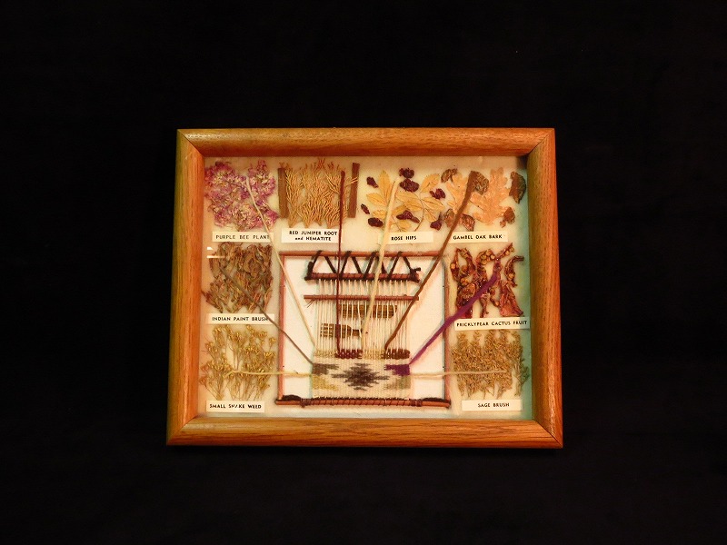 そのような織物につかわれたナバホの染色技術は大変原始的ですが、数百年にわたって受け継がれ、現在でも全て草木染(木の実や皮、葉っぱなどを用いる染色)でそれらに必要な植物を標本として紹介しているのがこちらのフレームです。