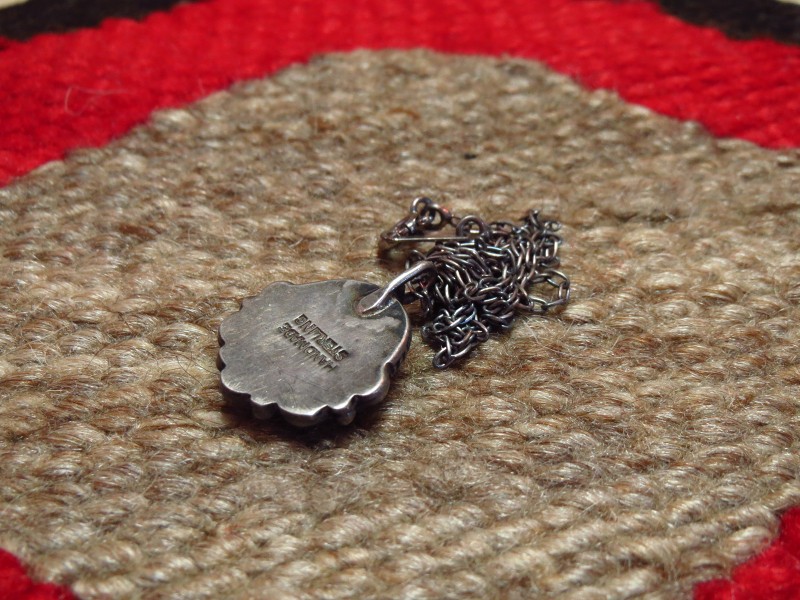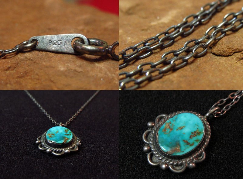 『STERLING』の刻印については、銀含有率92.5%の地金であることを示す表記であり、1930年代中頃には登場していた刻印です。ただし、ショップやトレーディングポストにおいて多用されるようになったのは戦後である1940年代末以降のようです。1940年代以前に作られたツーリストジュエリーでも散見されますが、第二次世界大戦中の銀の不足が影響したと推測され、1940年代末以降の作品で非常に多くみられるようになりました。『925』の表記も同じ意味を持っていますが、925の刻印はインディアンジュエリーにおいては非常に新しく採用された刻印であり、そのほとんどが1990年代以降の作品に刻印されています。