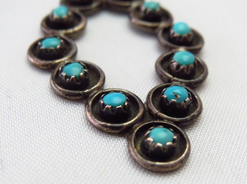 ズニジュエリーとしては長く作られている伝統的なスタイルを持ったピースで、1960年代後半~90年代頃までその制作時期は広く可能性が考えられますが、とても古い作品と同様にすべての工程がハンドメイドにより丁寧に作られた作品です。インディアンジュエリーの中では繊細で細かな技術を得意とするズニらしいシルバーワークにより構成されており、ニードルポイントというとても小さくカットされたターコイズを複数配置するデザイン/造形がメインとなっています。また、それらのターコイズは丸く縁どられたシルバーワイヤーの中央にセットされており、それらのシルバーワイヤーはシャドーボックスに近い陰影を生み出しており、作品に奥行きを与え、ターコイズを強調する効果をもたらしているようです。また、ニードルポイントの中でもこちらの様な小さなラウンドカットターコイズを用いたピースは、蛇の目に似た造形の為『スネークアイ』と呼ばれています。このような小さなターコイズのカットやそれらをセットする造形は、非常に繊細な仕事が必要であり、ナバホジュエリーとは違った印象を持っていますが、伝統的なインディアンジュエリーらしい表情も感じられる造形スタイルです。