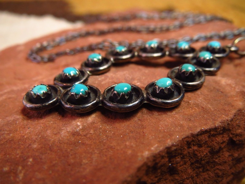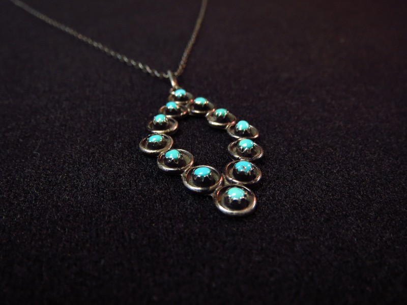 ズニジュエリーらしい繊細なシルバーワークで構成されたトップは静かでシックな印象を持っていますが、羅列されたターコイズによって独特の主張も感じ、控えめなサイズ感等、さり気なく多くのスタイリングに馴染みやすいネックレス。ビンテージインディアンジュエリー特有の味わい深い表情は、性別を問わず自然にフィットし、良いアクセントになってくれるアイテムです。