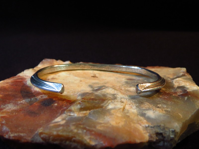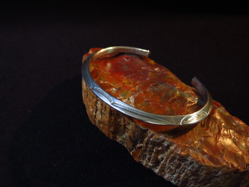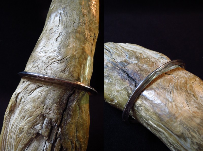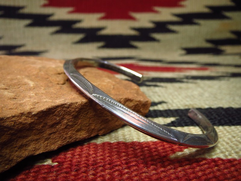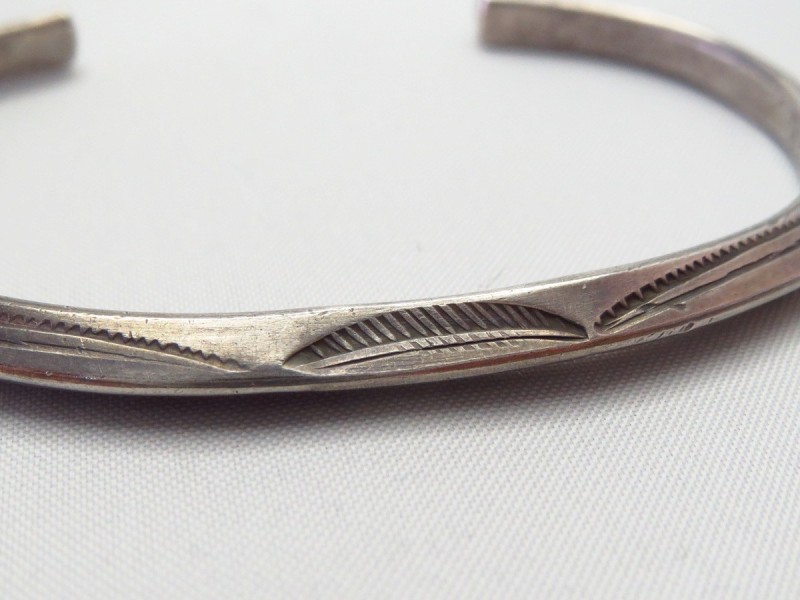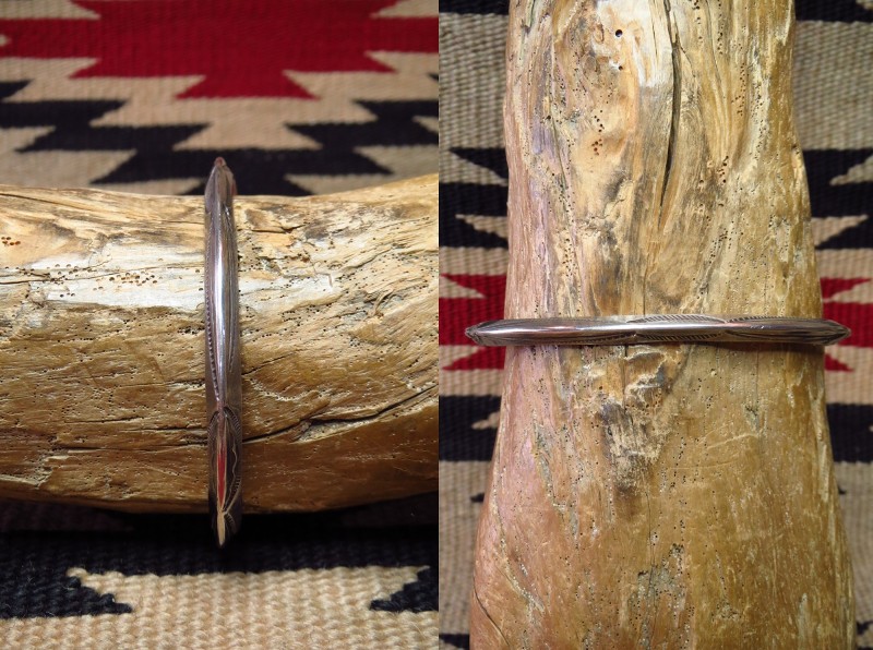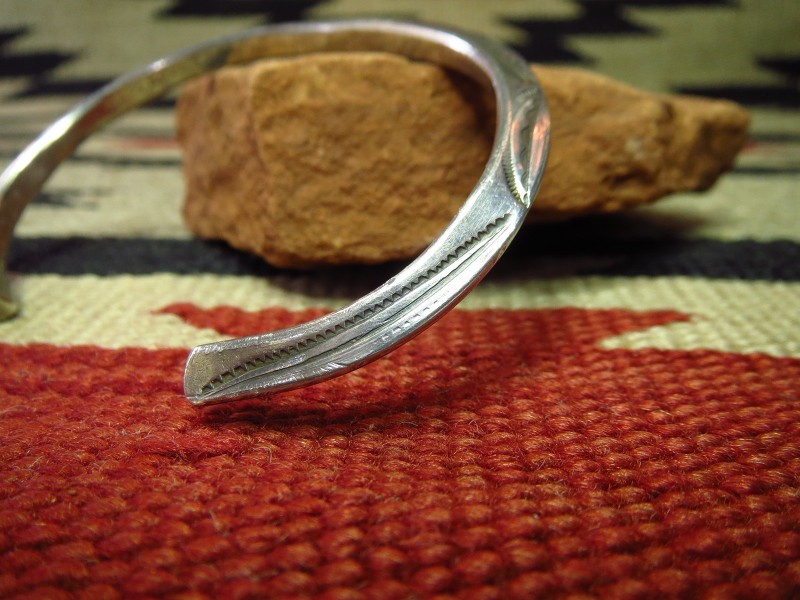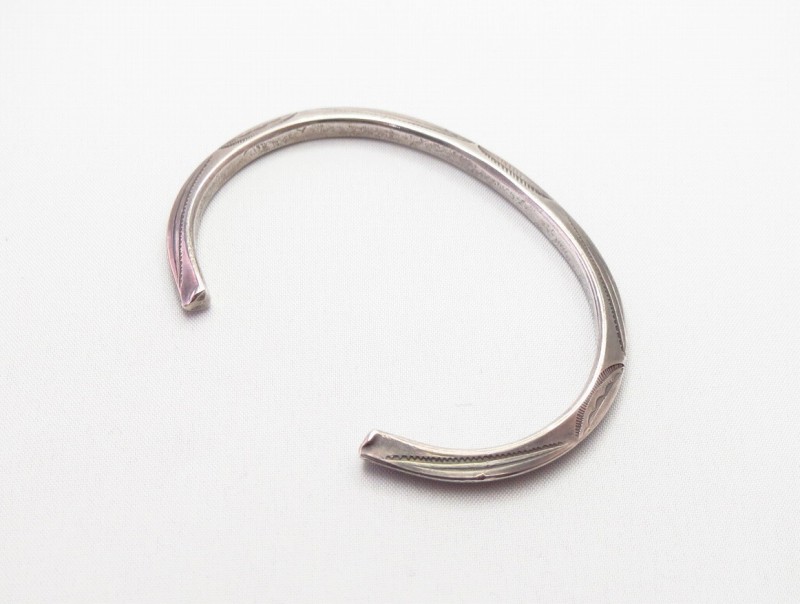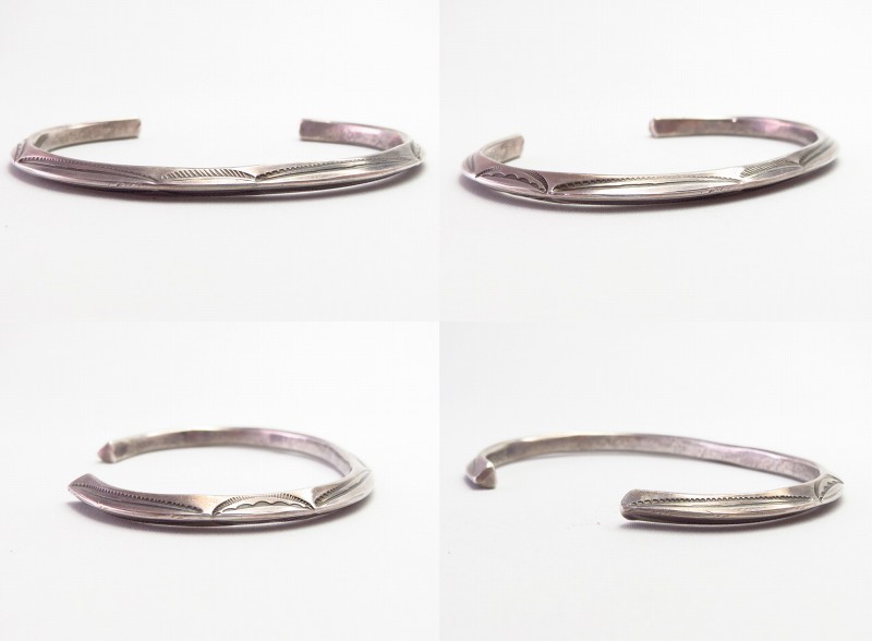 インゴットシルバー(銀塊)から成形されたトライアングルワイヤーは、トライアングル型に彫り込んだ溝にインゴットシルバーを叩きこむことで三角形の断面に成形しており、インゴット独特のシルバーの質感はとても硬くなめらかで、素晴らしい着用感を生んでいます。さらに、内側のエッジも少し丸く鞣されており、このようなディテールは1900年代~1920年代に多く見られるスタイルであり、複雑なディテールではありませんが、手間の掛ったアンティーク作品独特のスタイルです。また、スタンプワークもオールドナバホらしいシンプルでプリミティブな文様が施されており、その完成度を高めているようです。
