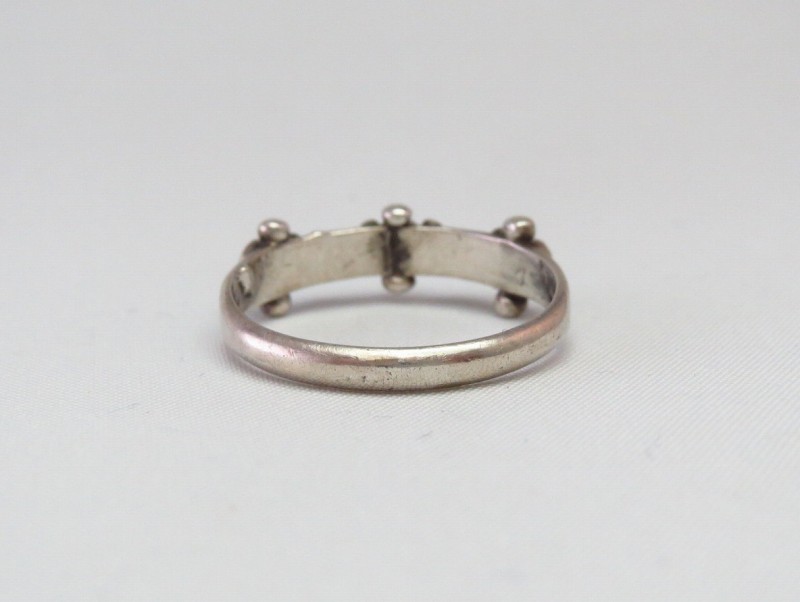 デザイン/造形は、『ローワーク』と呼ばれるターコイズを並べて配置する造形スタイルの作品で、ラウンドカットとオーバルカットのターコイズが交互に羅列されています。さらに、それらの間と上下には14個もの小さなシルバードロップ/ボールが精密に配されており、細部まで手の込んだシルバーワークによってナローで華奢なリングでありながら、美しく奥行きのある表情を持っています。