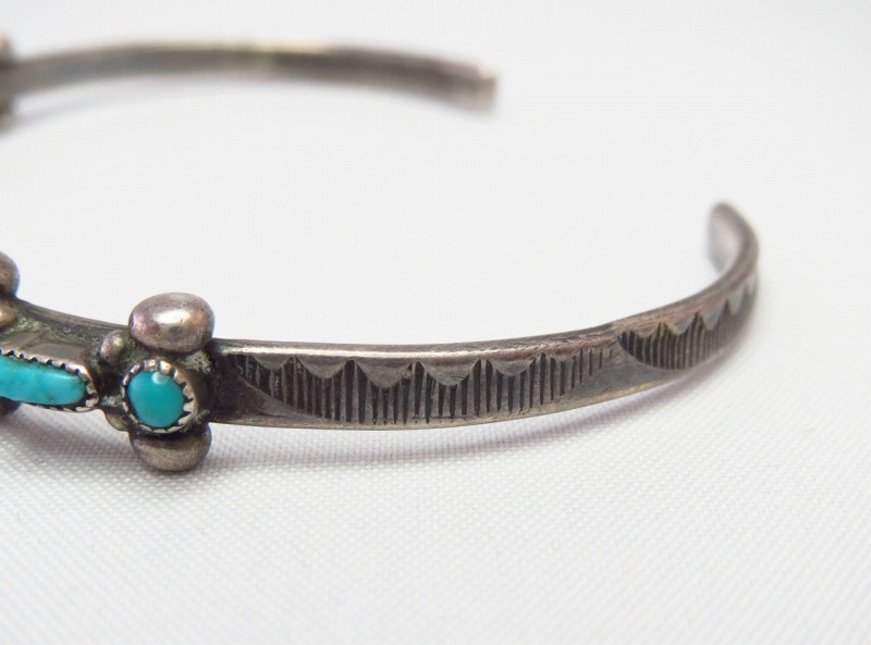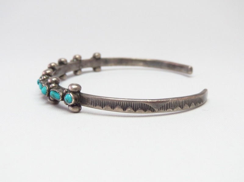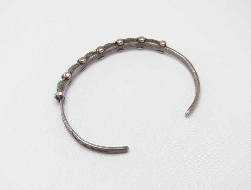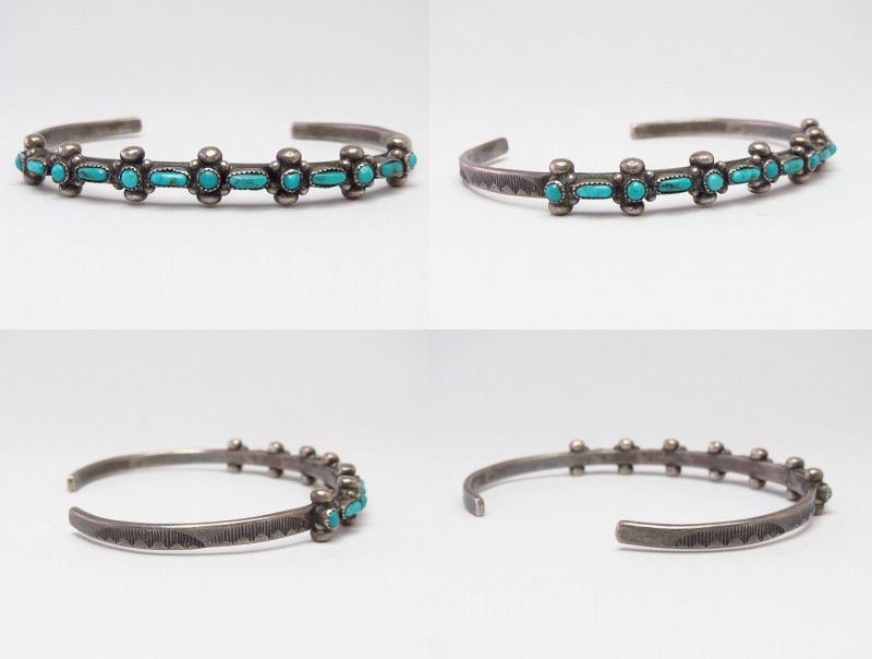 1940年代末頃~1960年代頃のピースと思われ、おそらくインゴットシルバー(銀塊)から成形されたナローなバンド/地金をベースに、『ローワーク』と呼ばれるターコイズを並べて配置する造形スタイルの作品です。ラウンドカットとオーバルカットのターコイズが交互に羅列され、それらの間と上下には38個もの小さなシルバードロップ/ボールが精密に配されており、一つずつハンドメイドされたシルバードロップにより、多くの同スタイルを持つ作品に比べ立体感と迫力のある造形に仕上がっています。さらに、サイドにはさりげなくスタンプワークが刻まれており、ビンテージインディアンジュエリー独特の味わいが感じられ、細部まで手の込んだシルバーワークによってナローで華奢なボリューム感でありながら、美しく奥行きのある表情を持っています。