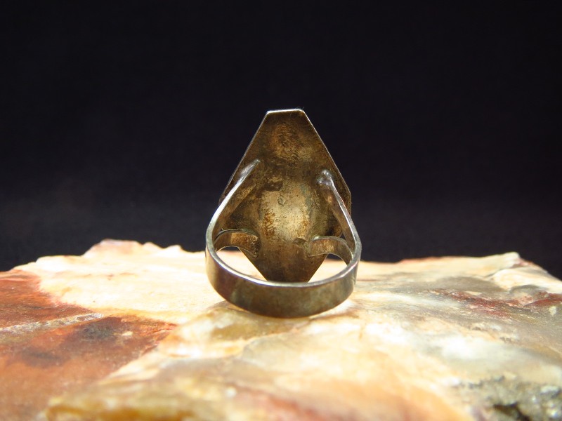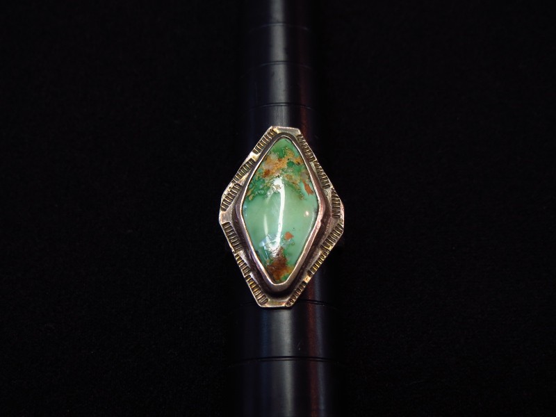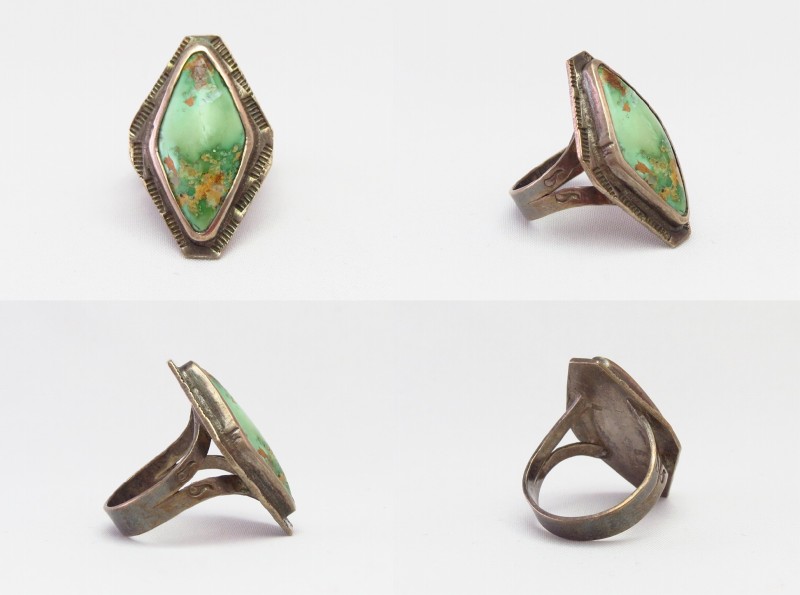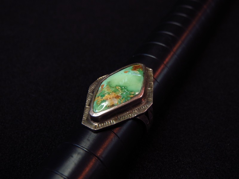 【NAVAJO】ナバホか【PUEBLO】プエブロの職人による作品で、【Tourist Jewelry】ツーリストジュエリーと呼ばれる1910年代~1950年代当時に観光客向けに作られたスーベニアアイテムですが、量産されたピースではなく伝統的な技術によって構成された作品。珍しいダイヤ型/菱型の美しいグリーンターコイズがセットされたアンティーク/ビンテージリングです。