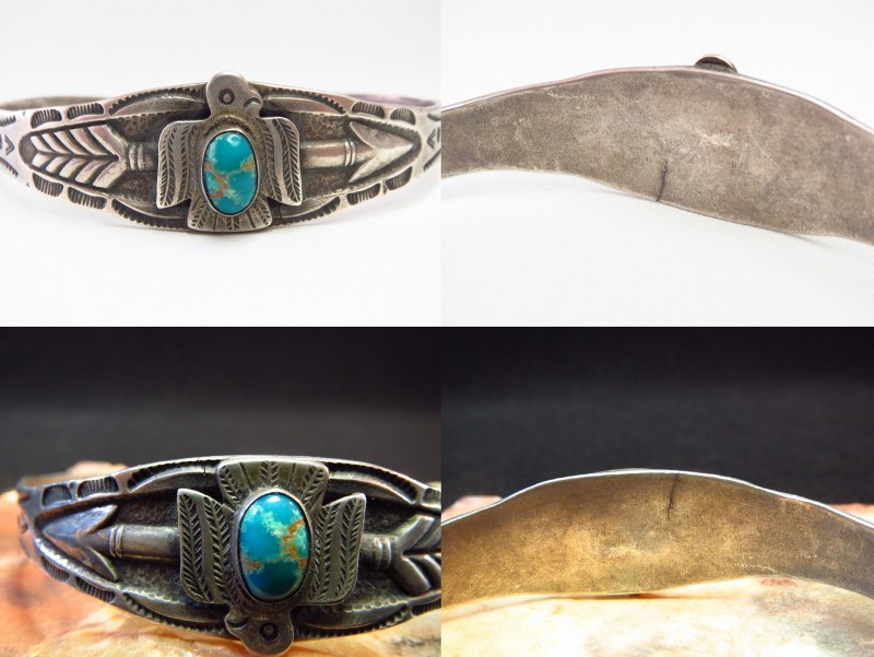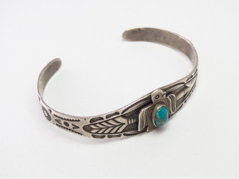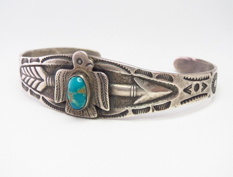 センターが広く、ターミナル(両端)にかけて細くなるシェイプのバンド/地金はクラシックな印象を持ち、大きくアローのデザインが立体的に施されています。そして、センターには美しいターコイズがセットされたサンダーバードのアップリケ/パッチワークが施され、ツーリストジュエリーやフレッド・ハービースタイルと呼ばれるスタイルを代表するキャッチーでビンテージらしい質感を持ったバングルです。さらに、サイドからターミナルにかけてはエッジ部分に立体的な刻みが施され、全体に細かく刻まれたスタンプやサンダーバードのアップリケなどにより、立体感と奥行きのある表情が付加されており、バランスの良いボリューム感と存在感も作っている様です。
