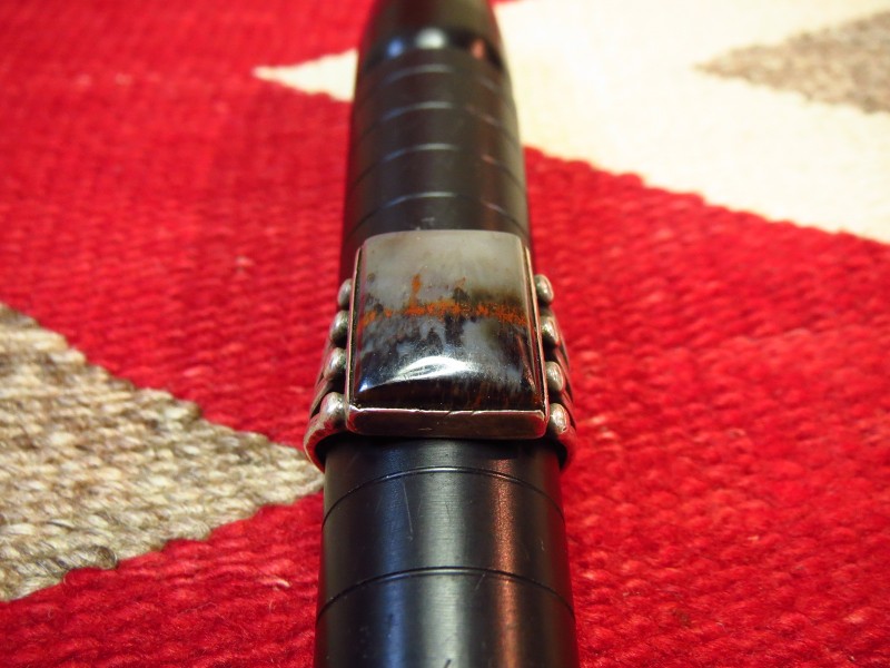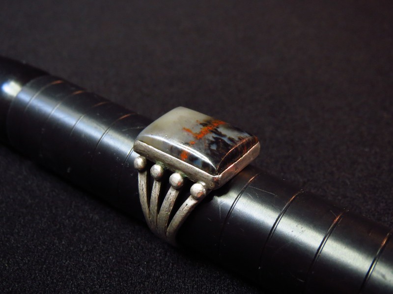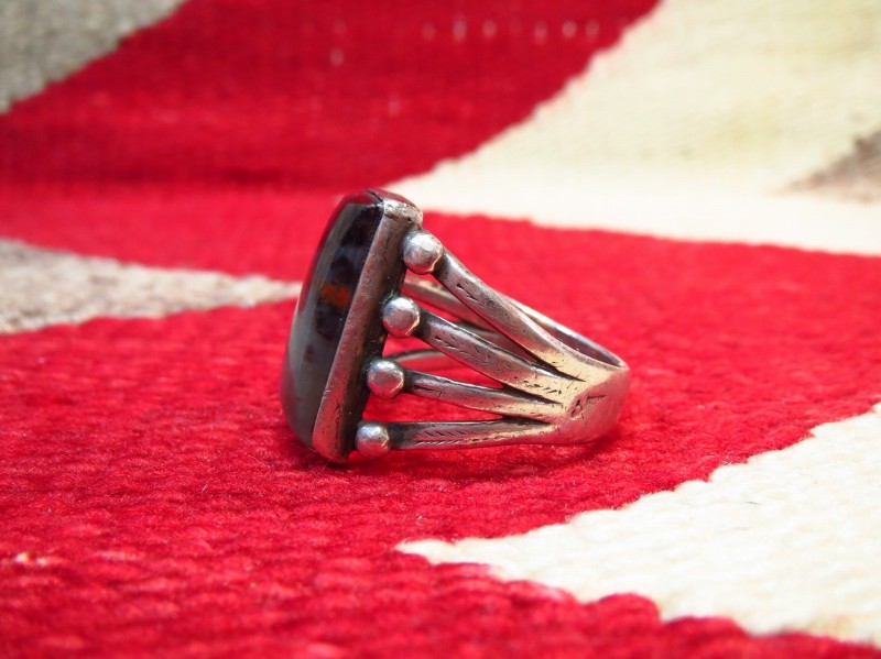 ナバホの伝統的なスタイルに仕上げられた作品で、1940年代前後に作られた作品と思われます。おそらくインゴットシルバー(銀塊)より成形された重厚なシャンク(地金)は、美しいシルバーワークによって4本に割り開かれた『スプリットシャンク』と呼ばれるトラディショナルなスタイルに造形されています。そして、フェイスにセットされたペトリファイドウッドのベゼルとシャンクとの間にはシルバーボールが施されています。また、さり気なくシャンクのサイドにはスタンプワークによる模様が刻まれており、両サイドには、摩耗によって不明瞭になっていますが、サンダーバードのスタンプが刻まれているようです。